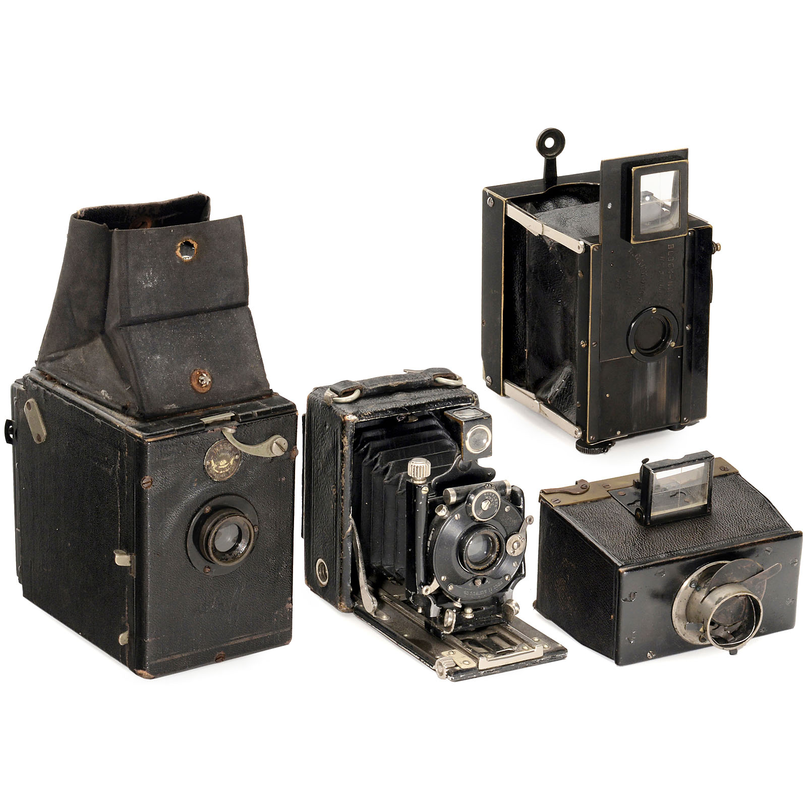 1) Rietzschel, Munich. Miniatur-Clack I, c. 1911, Linear Anastigmat 4,5/60 mm in Compound. (4/3) – 2) Ihagee, Dresden. Plan-Paff-Reflex 4,5 x 6 (no. 4), c. 1921, Trioplan 6,8/8 cm, shutter Z + M. (4/3-) – 3) Gaumont, France. Block-Notes, c. 1904, lens unmarked. (3/2–3). – And: 4) Unmarked 4,5x6cm plate camera, Jumelle-style, presumably Mackenstein, unusual lens/shutter combination. (¾)