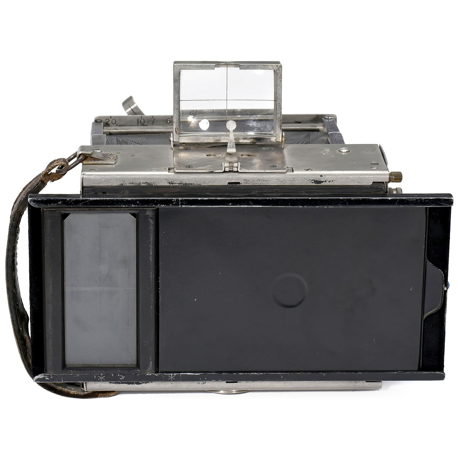 L. Gaumont & Cie., Paris. Heavy-metal strut-folding reporter camera, with special back for 3 photographs of 4 x 9 cm (plate 10 x 15 cm), slidable focusing screen back of 4 x 9 cm, focal plane shutter (sluggish), with Berthiot Flor No. 3 Serie I 4,5/135 mm.