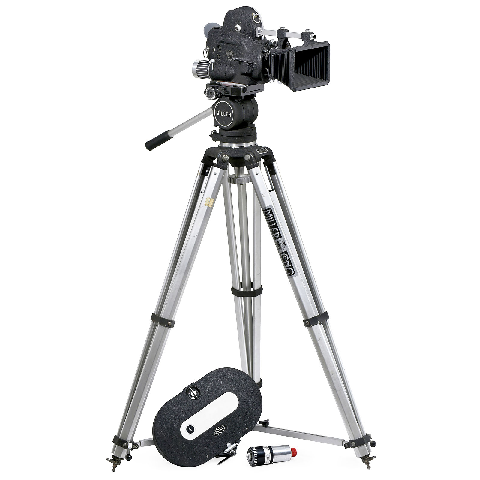 Arnold & Richter, Munich. Reflex movie camera for 30m daylight cassettes and for 120 m film, electric drive, rotating lens head for 3 lenses: Schneider 1:1,8/10 mm, 1:1,4/25 mm and 1:2/50 mm. – In addition: Cassette for 120 m, motor, original case and professional tripod with "Hydro" head (Miller, Sydney, Australia). – Rare version of Arriflex 16 ST with built-in light meter. Camera in visual excellent condition. Electrical features not tested.