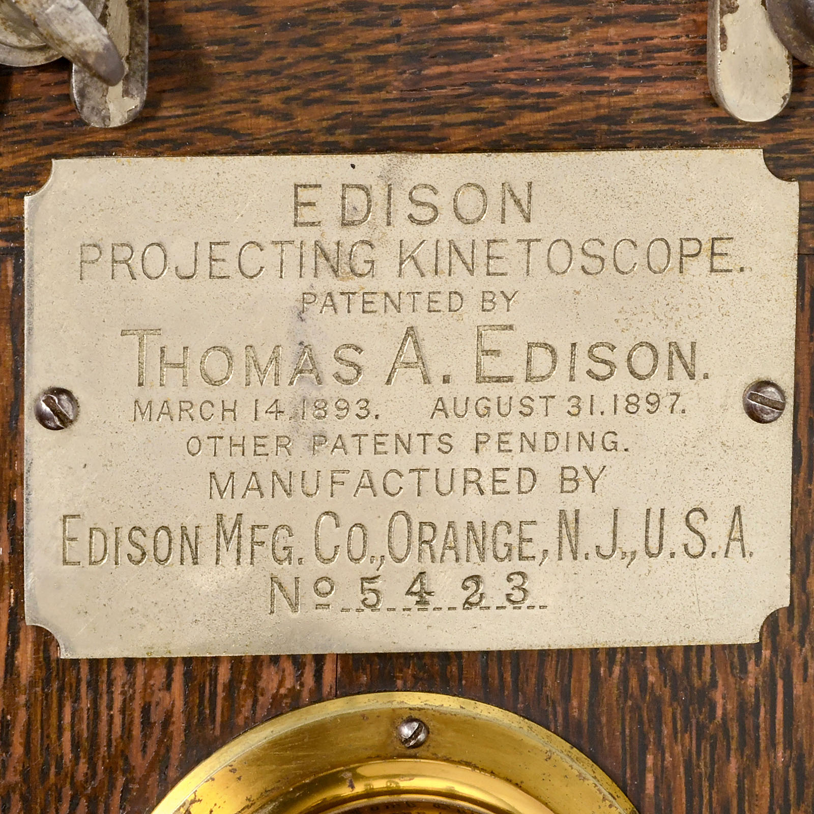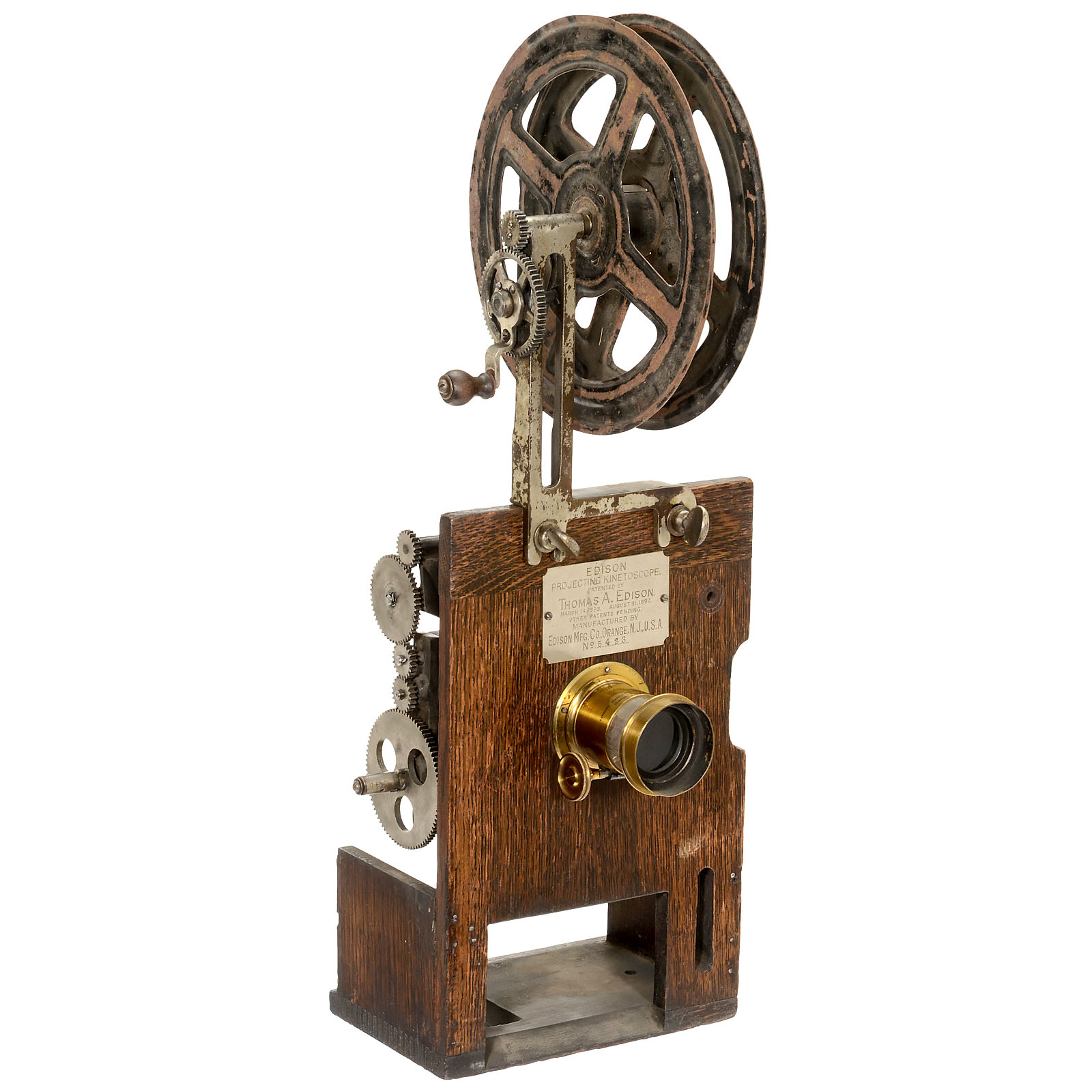 Edison Mfg, Orange, USA. Early original Edison projector for 35mm film, original lens: Bausch & Lomb No. 2A, specially made for T.A. Edison. No crank and cross. Serial no. 5423. – A terrific historical milestone and excellent collector's item and museum piece from the beginning of movie history!