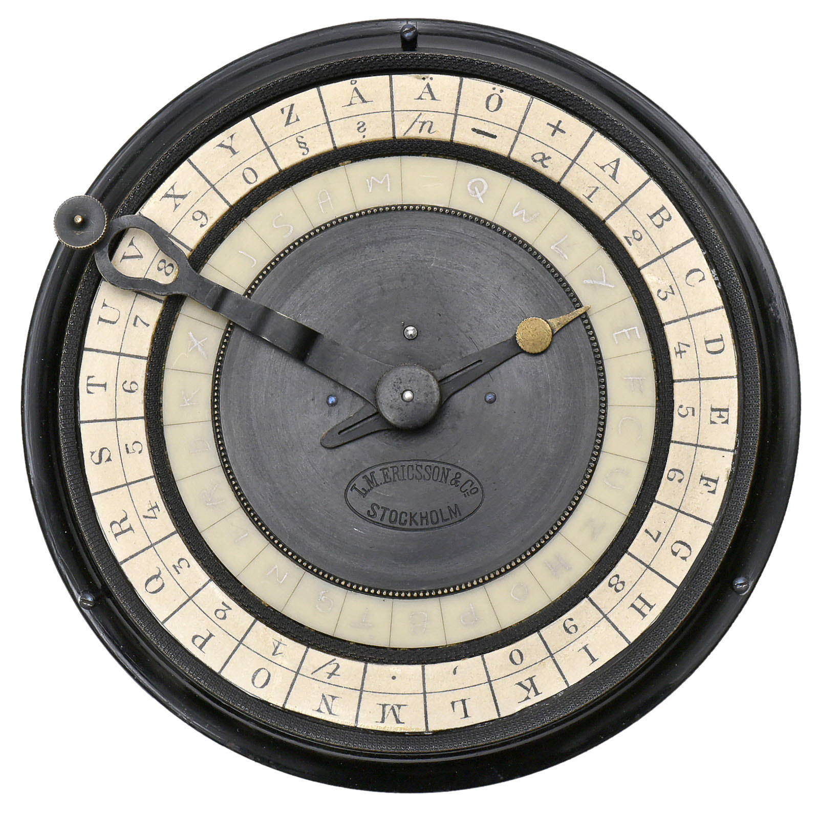Manufactured by L.M. Ericsson & Co., Stockholm. Polyalphabetic mechanical pocket coding and decoding machine, invented by the great British scientist Sir Charles Wheatstone, 28 fields in outer letter ring, 27 individually inscribable fields in inner ring, Ø 4 in., in velvet lined casket. – Extremely rare! Used by the Swedish navy and army during the 1880s.
