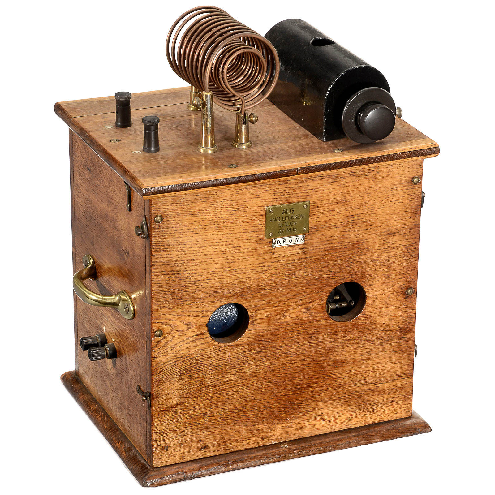 37 MHz, oak case with induction coil and battery, type plaque added, with spark gap on top, height 18 in.