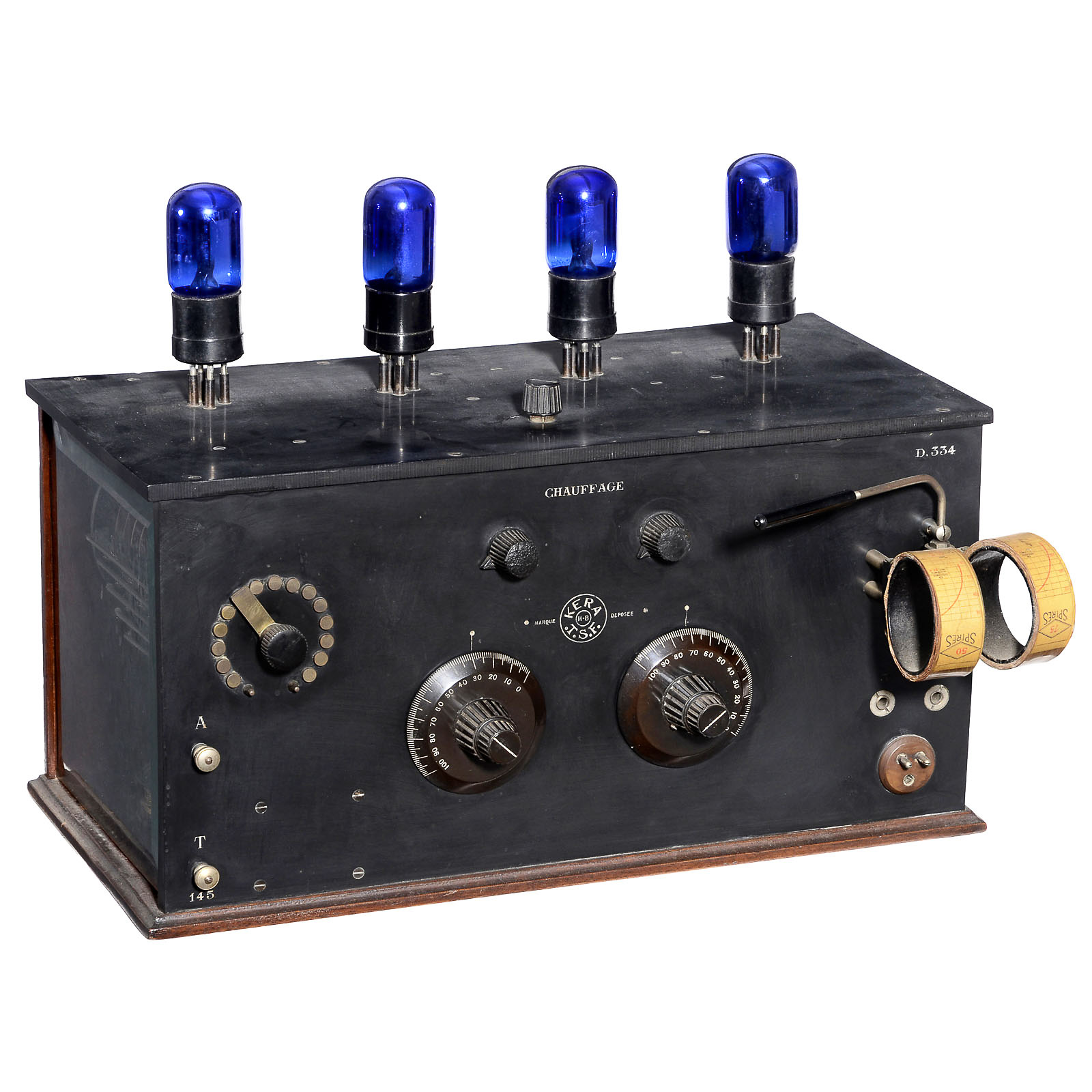 Kera-Brodin, France. 4-valve receiver, MW + LW, battery, wooden case, ebonite front and lid, acrylic sides, rare!