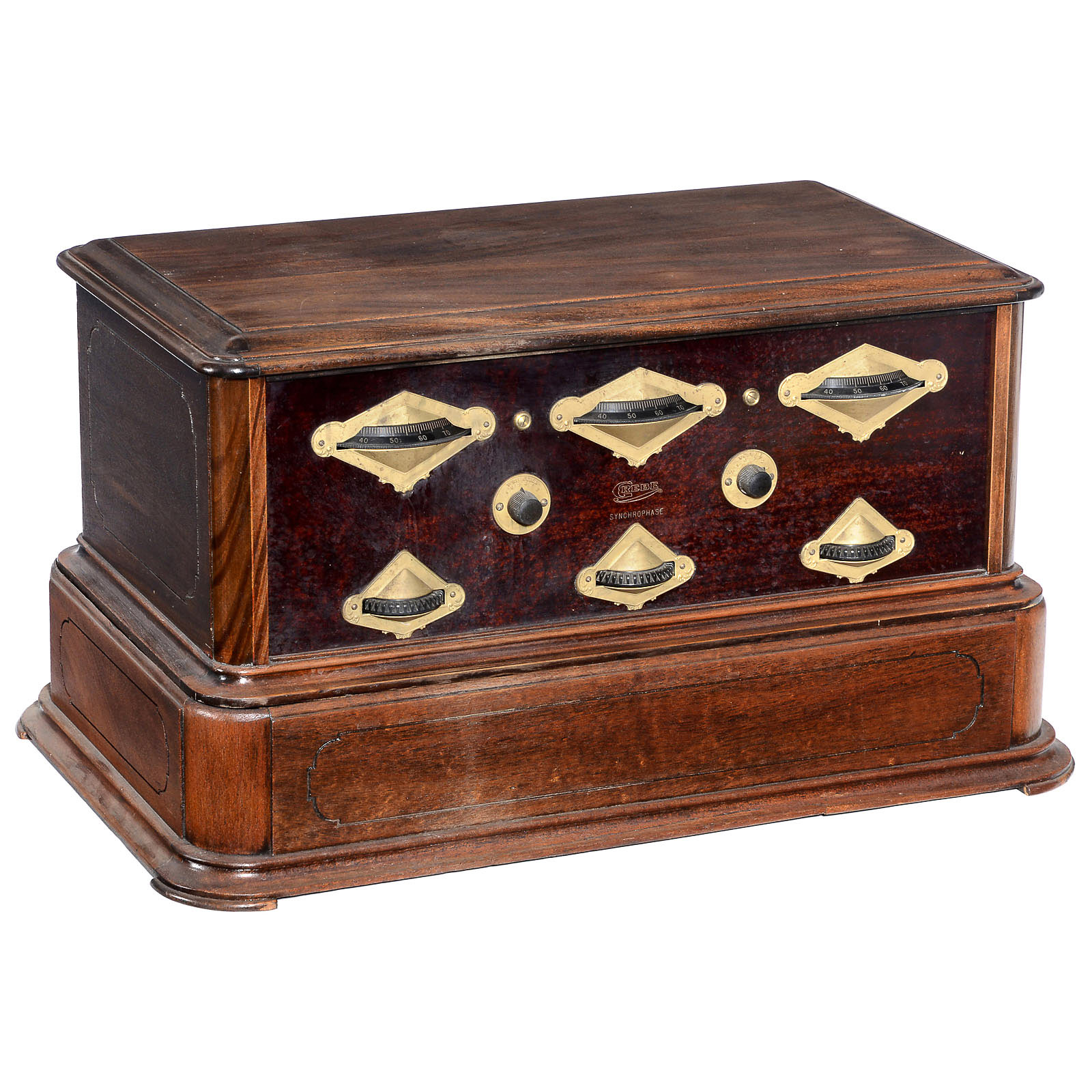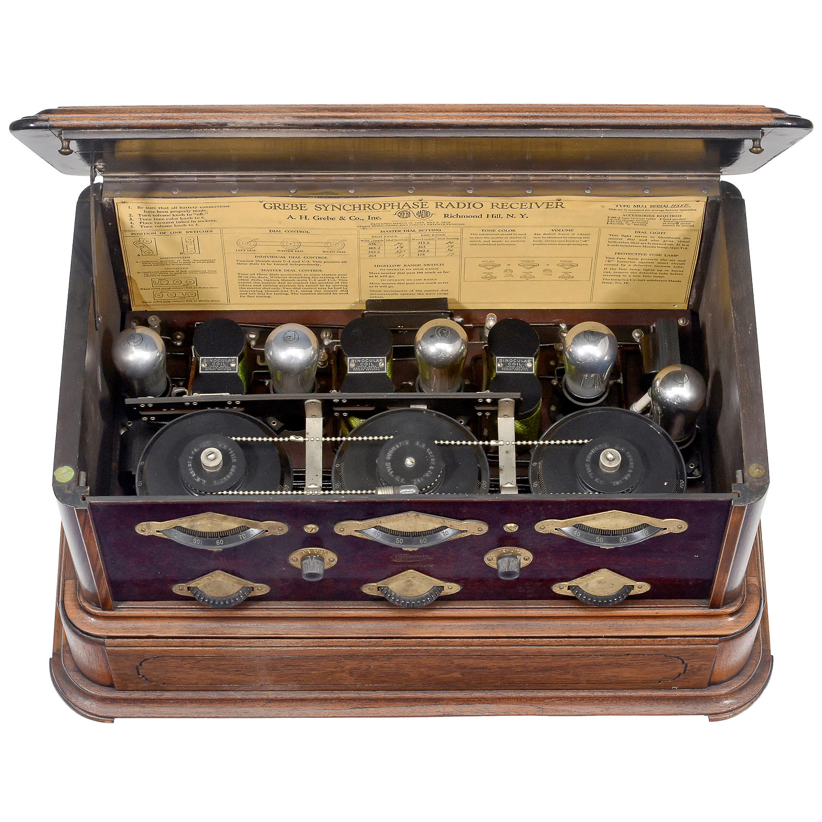 Type MU1, by "A.H. Grebe & Co., Richmond Hill, USA", 5 valves, battery, 3 primary tuning control knobs synchronized by a chain, 2-part wooden case, battery storage in lower section, inner lid with instructions. A beautifully constructed receiver!