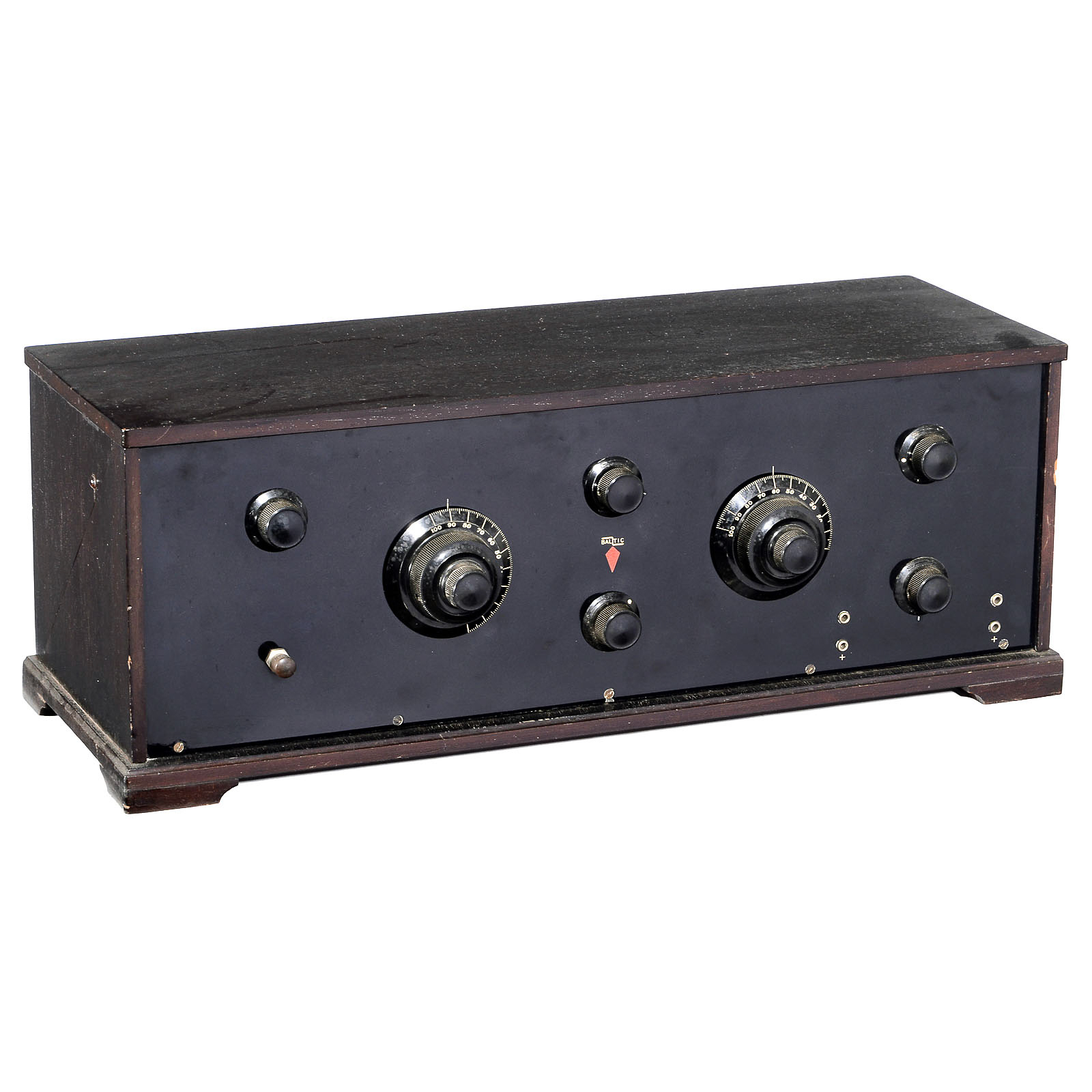 Swedish super-heterodyne receiver, 7 valves, battery-operated, 2 wave ranges, 26 in. wide wooden case, including matching frame antenna.