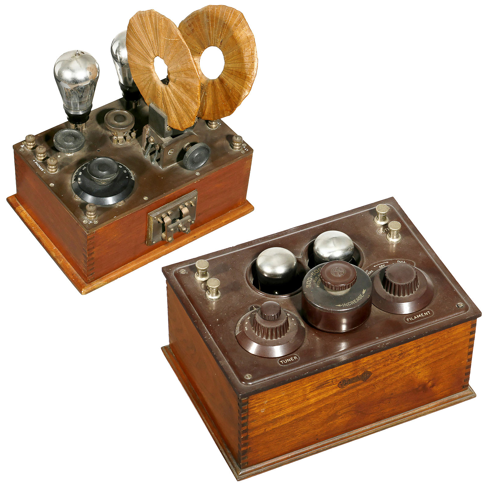 1) BTH type VR-2/BA, 2 tubes, BBC stamp. – And: 2) Unmarked, 2 tubes, 2 plug-in coils.