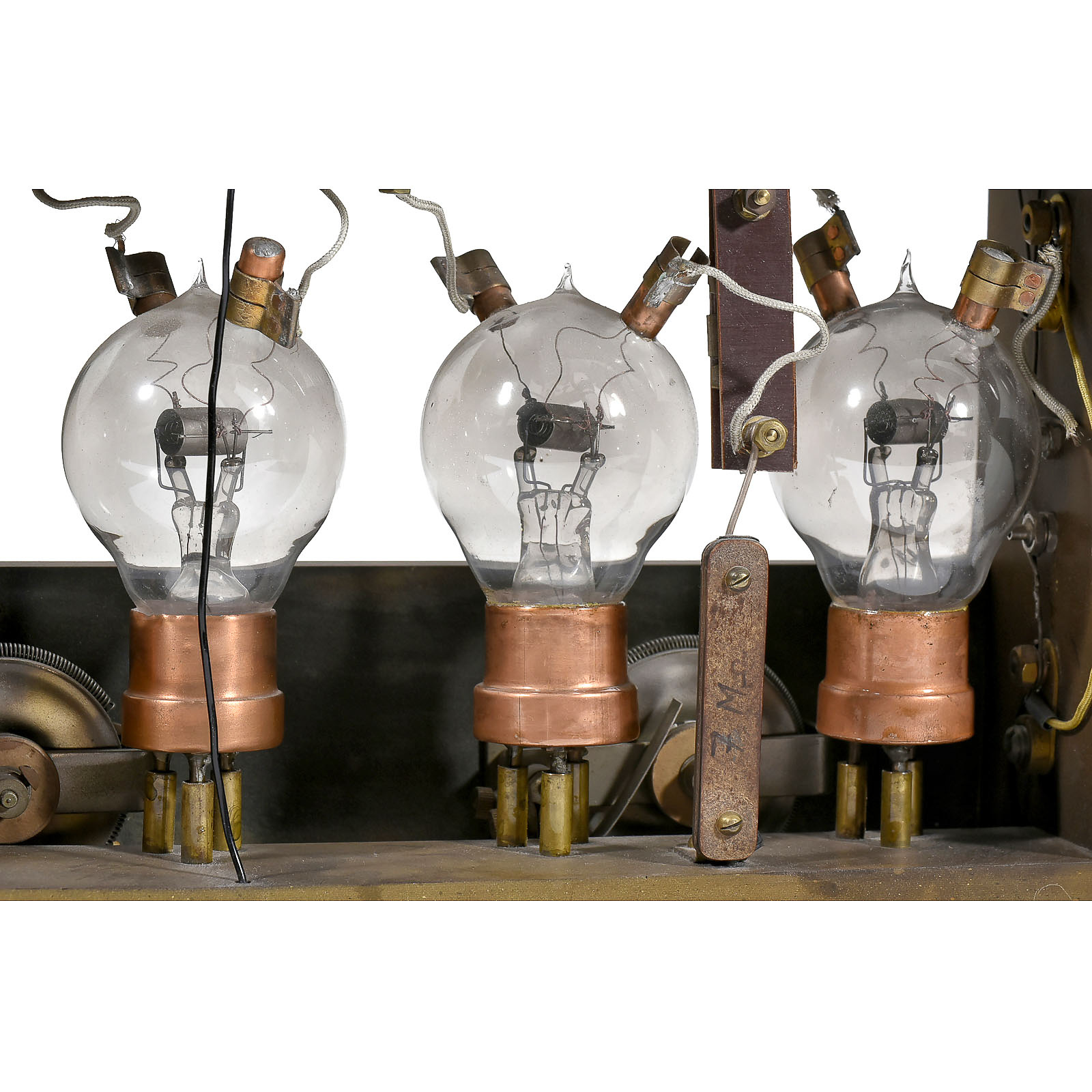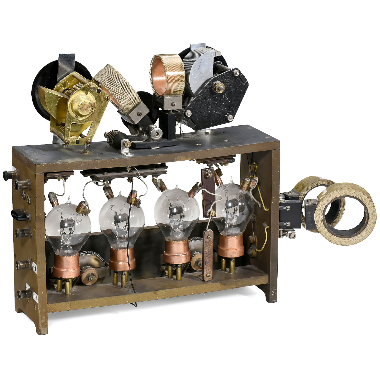 Ingeniously constructed receiver, with 4 early TMC triodes (filaments intact), coupled scale and variable plug-in coil, condensers and a further swiveling coil.