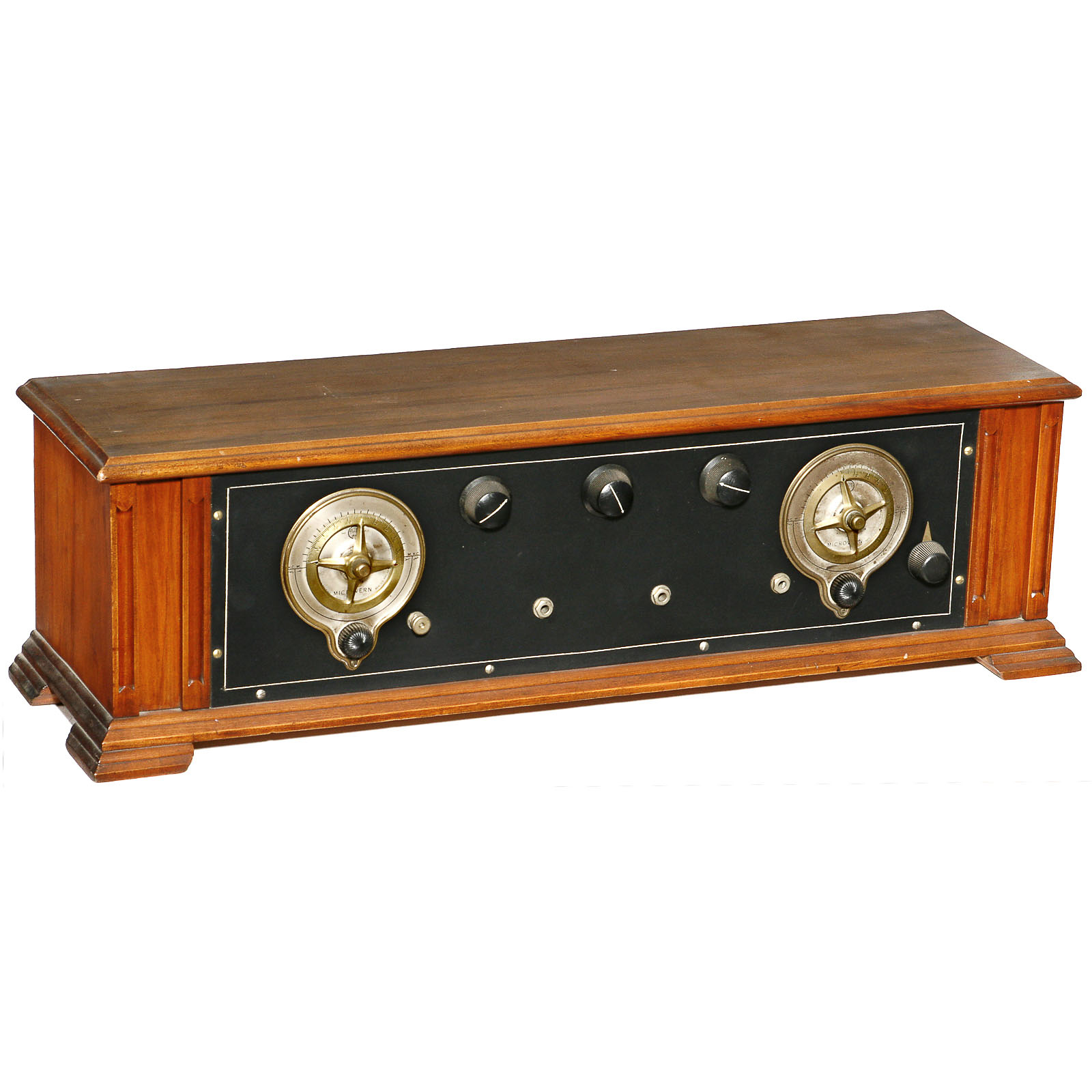 1) Pacent 150, 4-valve receiver, wooden case with lid. – And: 2) Neutrodyne 5-valve receiver, home-built with Freed Eisemann components.