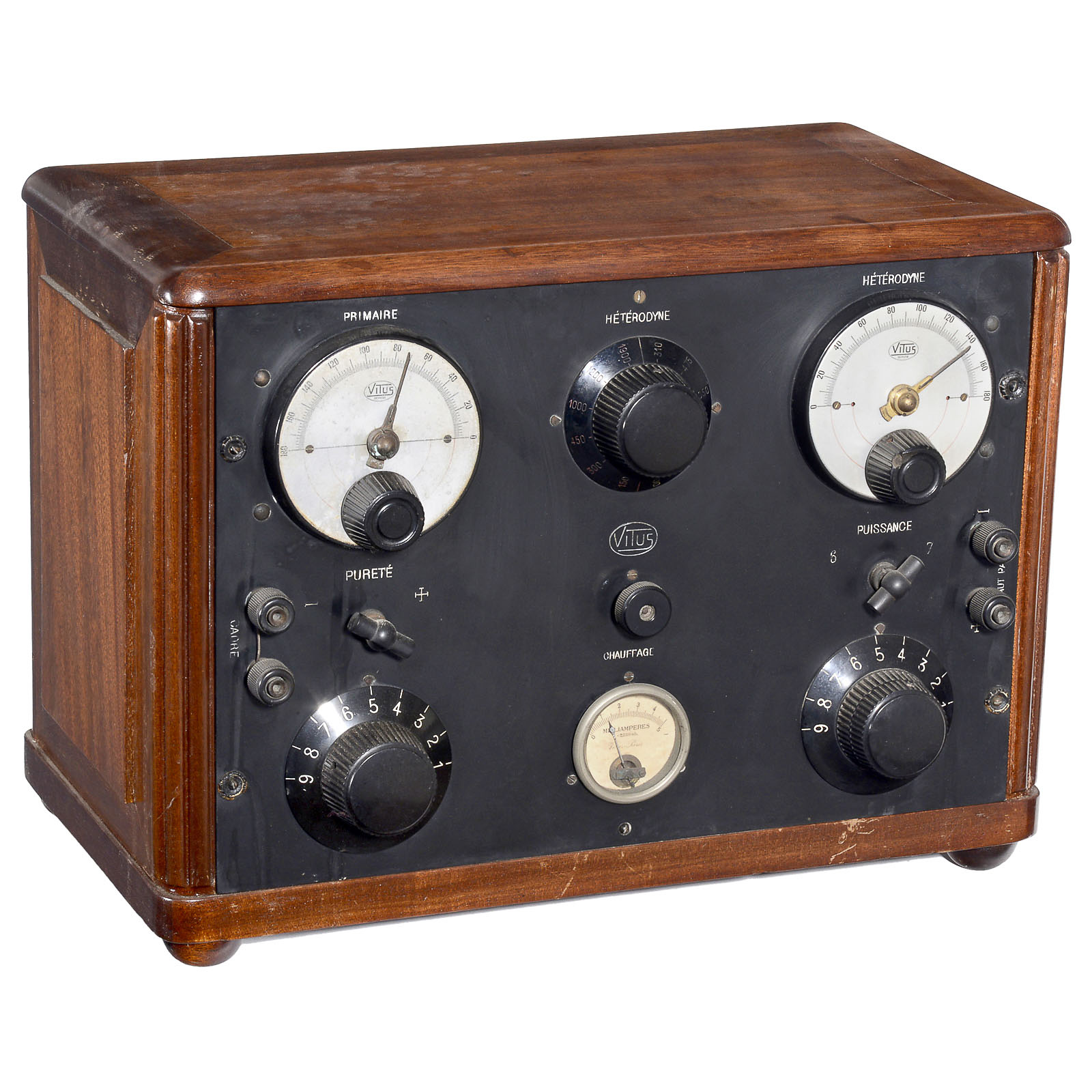 By Vitus et Hardy, Paris. 7-valve heterodyne receiver, wooden case with ebonite front, opening lid, width 19 in.