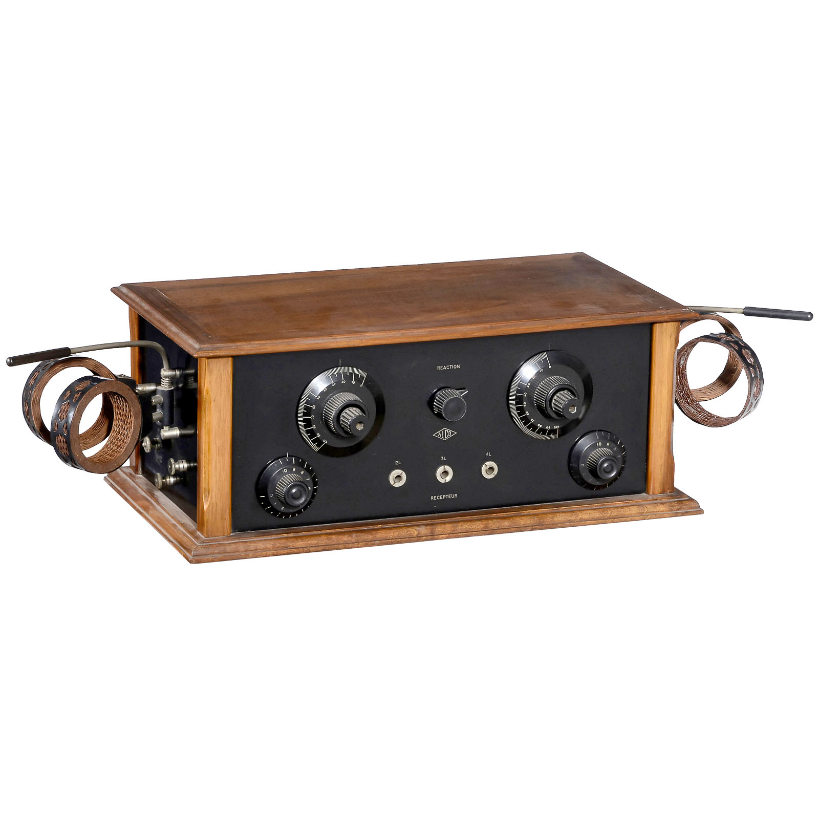 1) "Radio Delta" type A-8, by "Losange et Delta", French 6-valve battery receiver, plug-in coils, MW + LW. – And: 2) Alco Universel R4 radio, by André Laporte, Paris. 4-valve receiver, MW + LW, battery, 2 swiveling coils, wooden case with ebonite front.