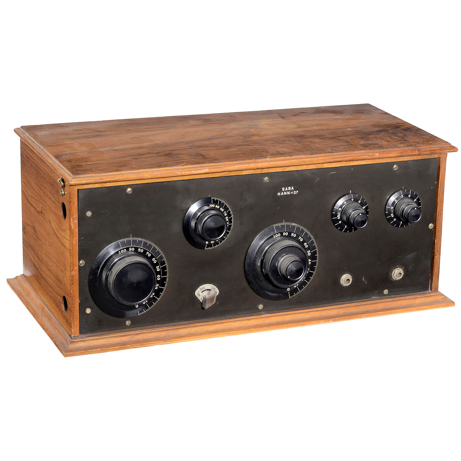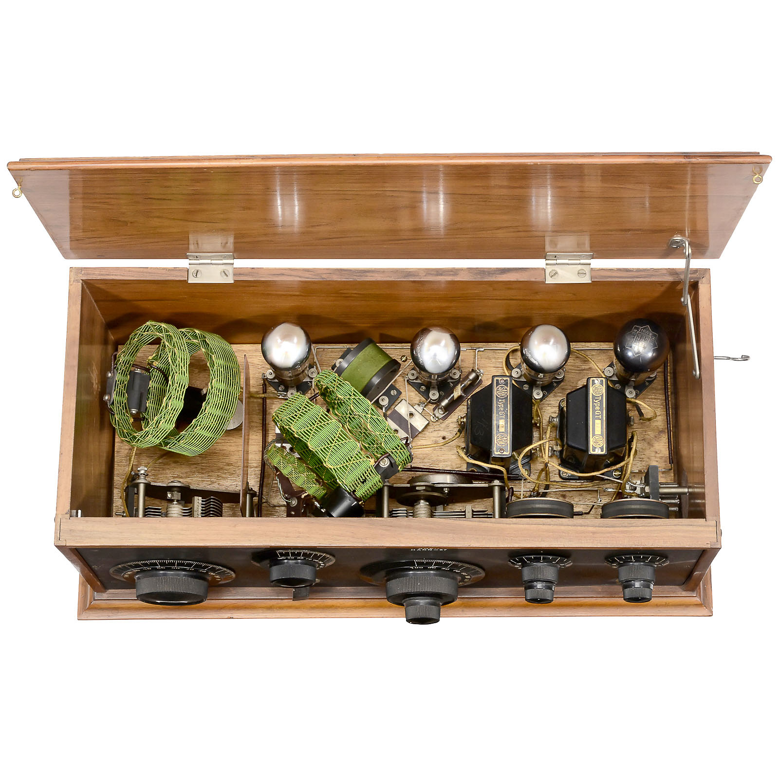 German 4-valve battery receiver, with original battery wires, wooden case with ebonite front, 22 in. wide.