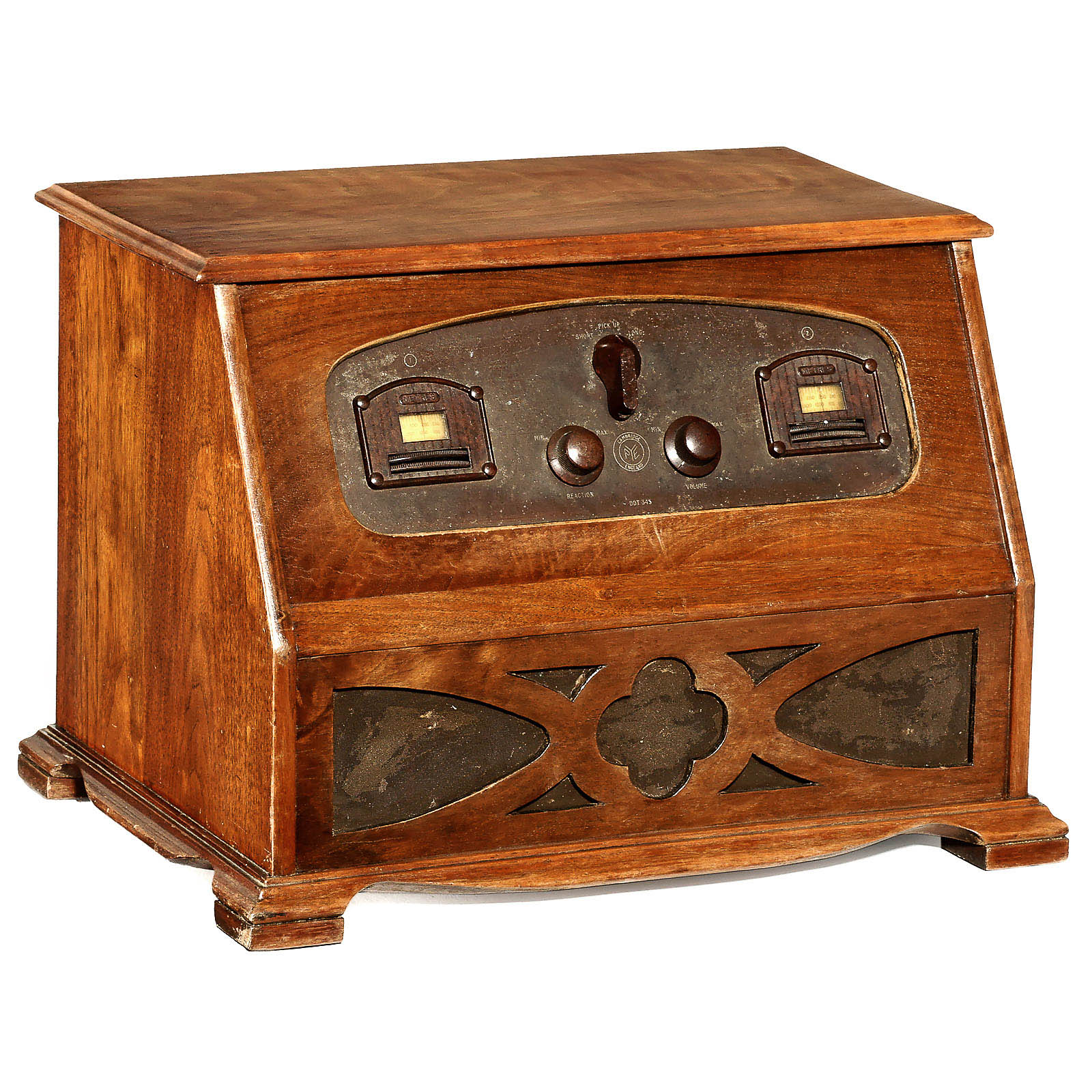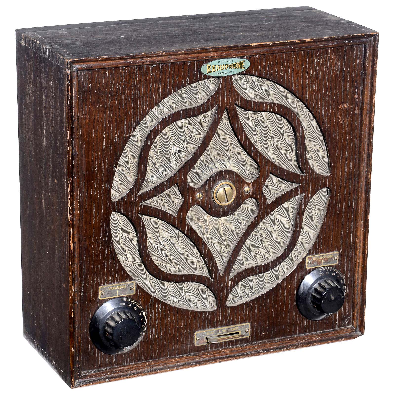 1) Pye model 350 All Electric radio, by Pye Ltd., Radio Works, Cambridge. 3-valve mains receiver, sloping control panel, acrylic back door, c. 1928. – And: 2) Radiophone model Straight Two radio, by British Radiophone, 2-valve battery receiver, 3 wave ranges, c. 1931.