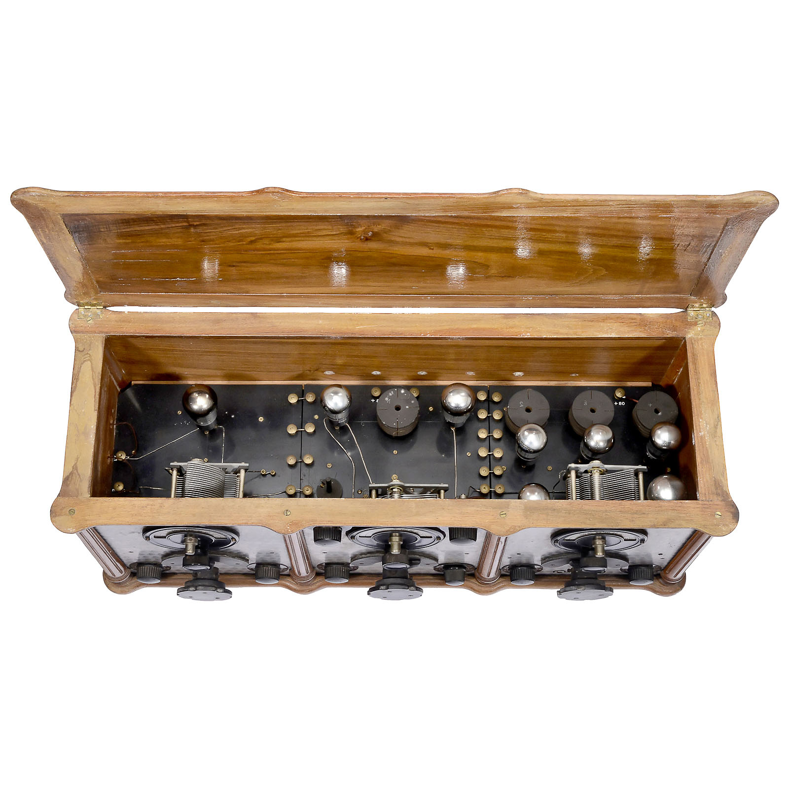 Unmarked, 8-valve receiver, 3-part metal front, solidly constructed.