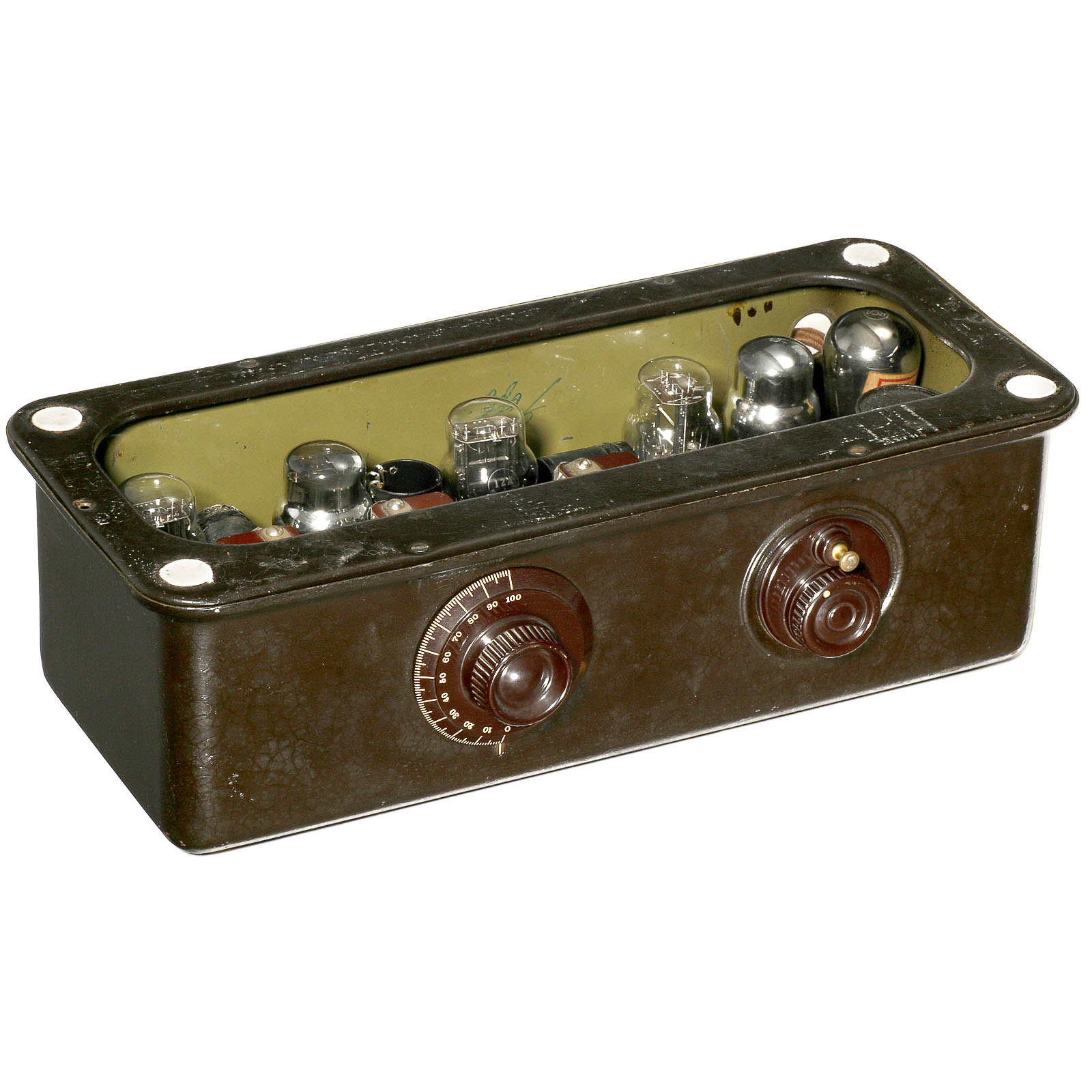 Serial no. 910350, 6 valves, battery, metal case with embossed label on lid.