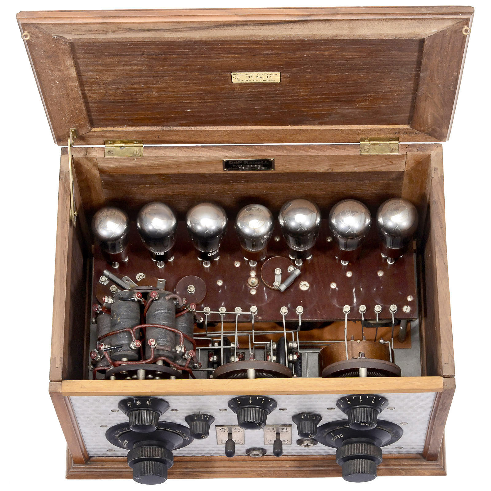 By L.L., Paris; no. 3318, 7-valve receiver, wooden case with metal front.