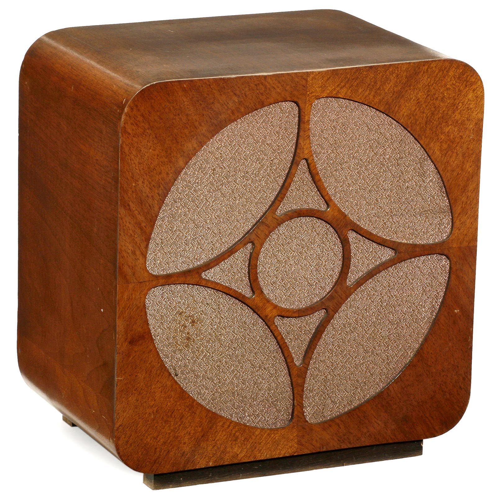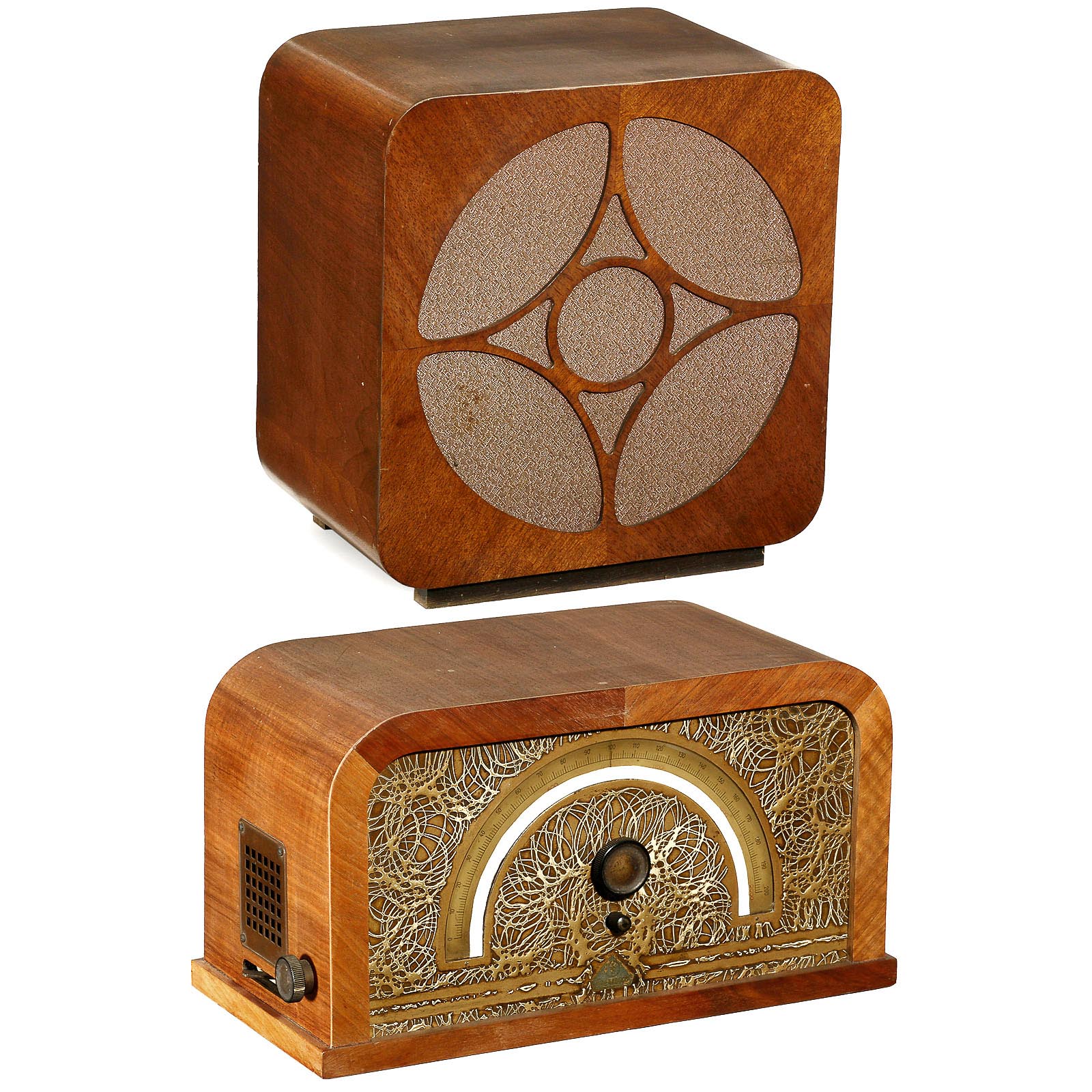 1) Siemens type 35W radio, large semi-circular scale, 4-valve mains receiver. – And: 2) Blaupunkt 51R loudspeaker by Ideal-Werke, Berlin.