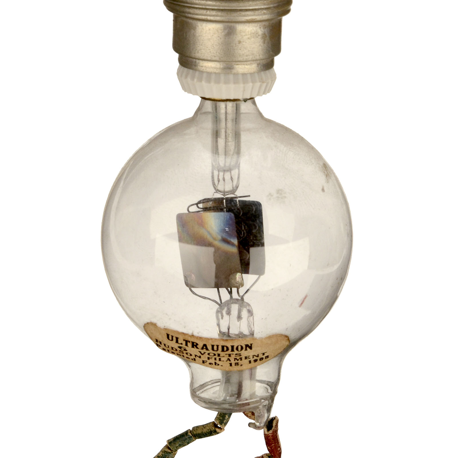 Maker unknown. Early American radio model, labeled "De Forest Radio-Telephone System", wooden case, ebonite lid, 2 ceramic resistances, 2 Audion valves in gooseneck mounts. An interesting construction and an attractive exhibition piece. – See also: www.radiomuseum.org!