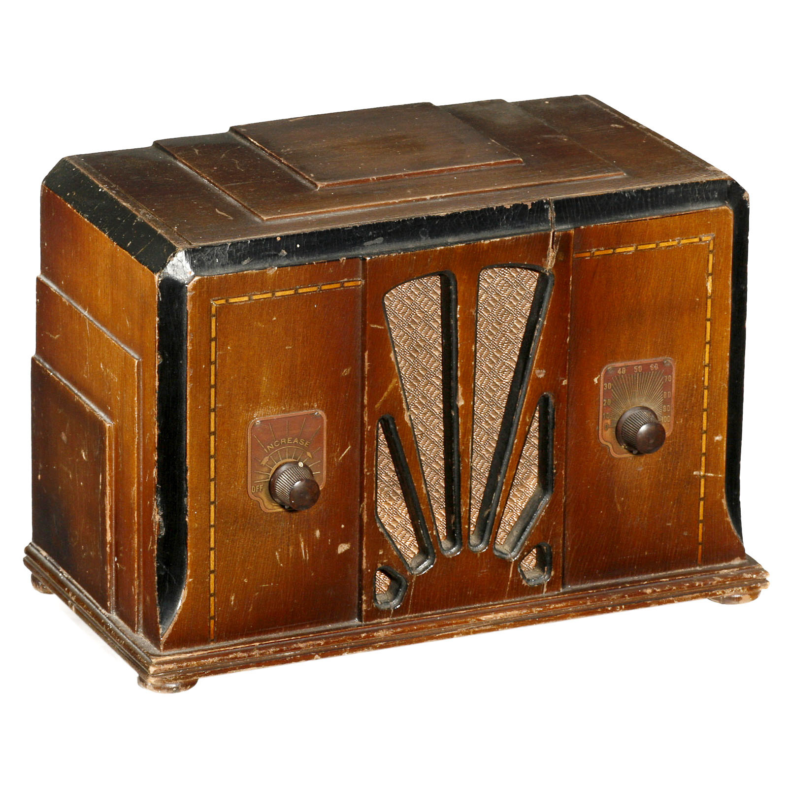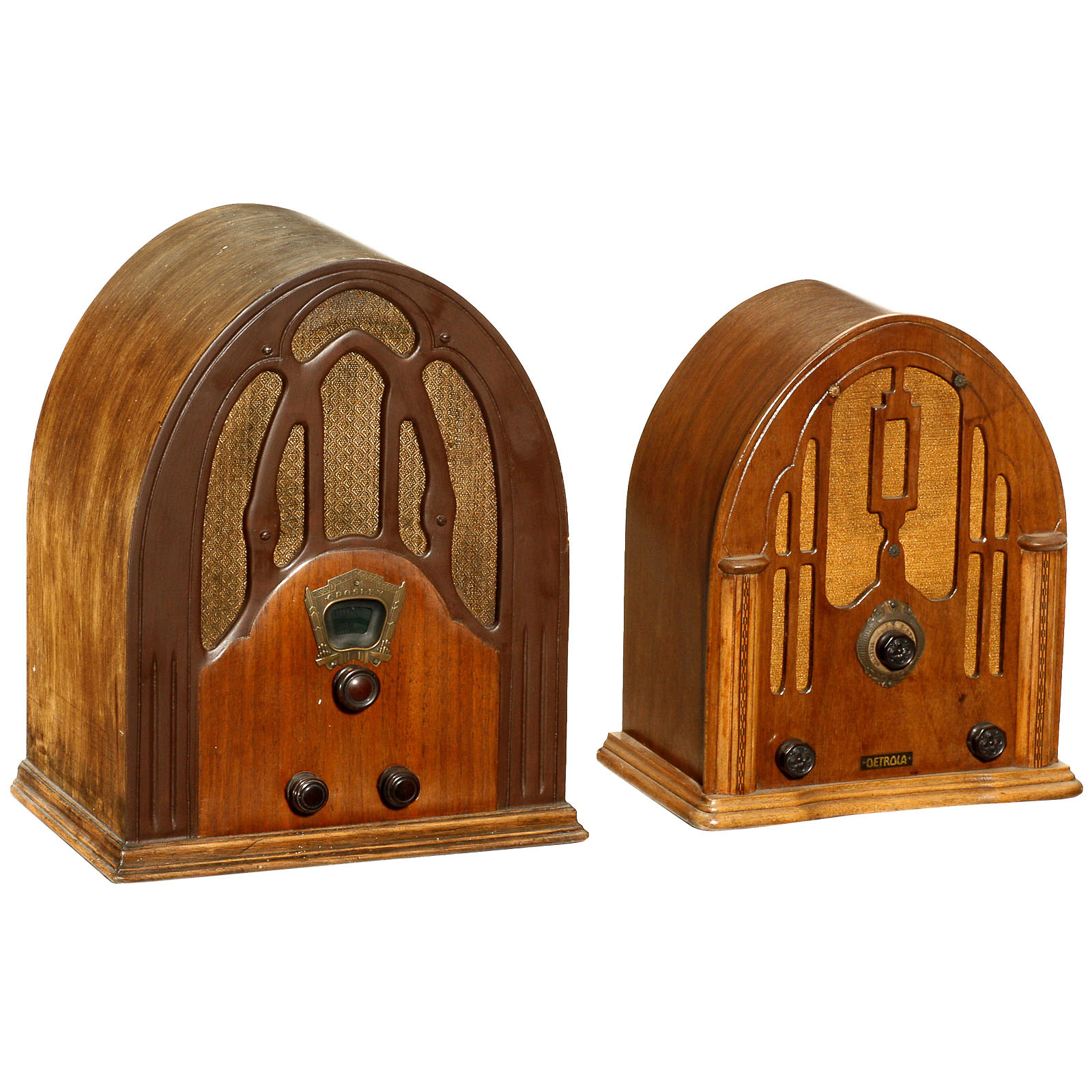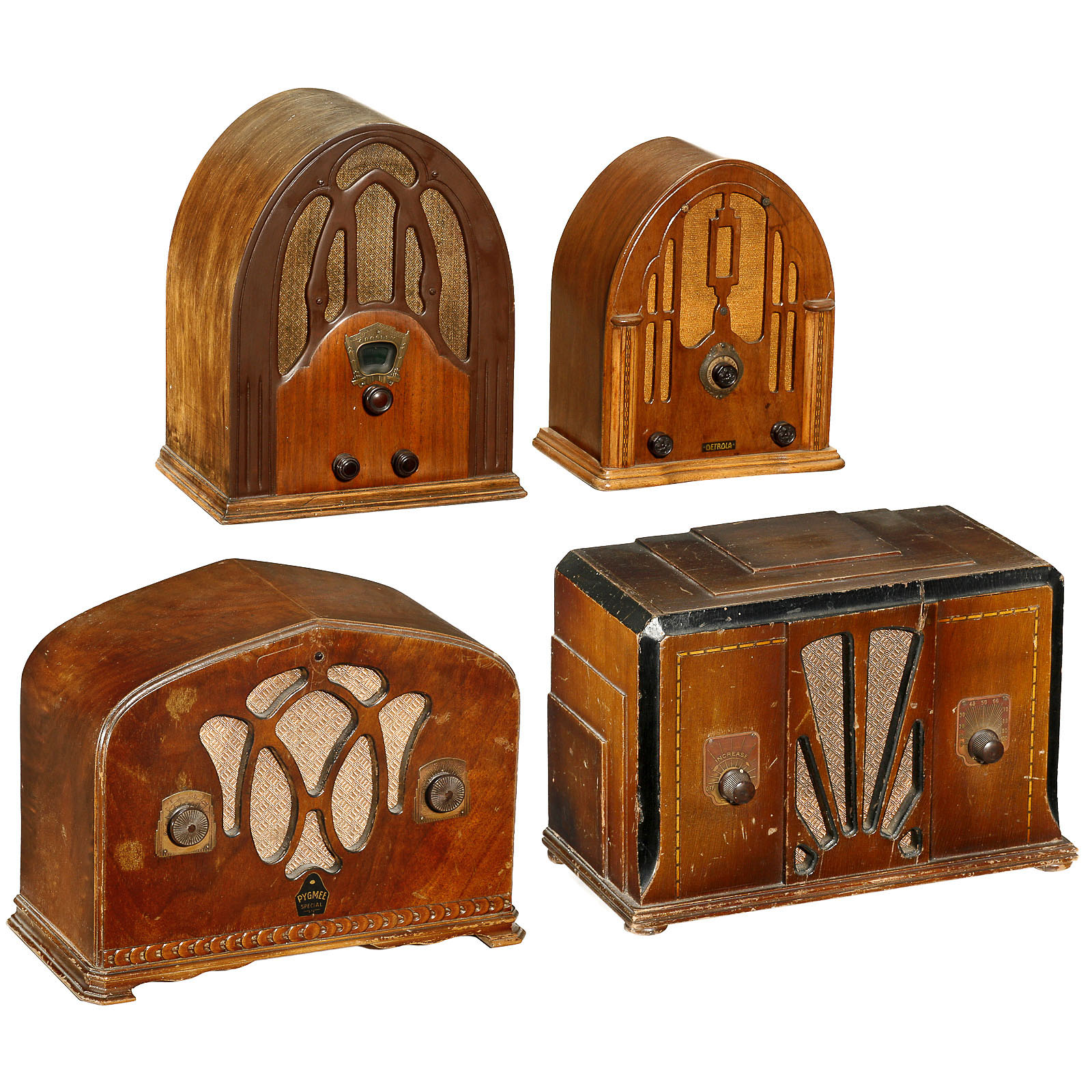 1) Crosley, model 167, 5 valves, 1931. – 2) Pygmee Special, 5 valves, 1932. – 3) Marvel "Micro Midget", 5 valves, 1931. – And: 4) "Detrola" Westinghouse, 4 valves, 1931.
