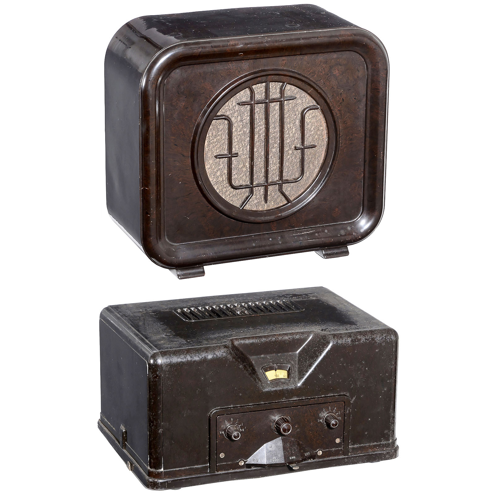 Bakelite cases. 1) 5-tube receiver 41W. LW + MW. – And: 2) Dino P loudspeaker.
