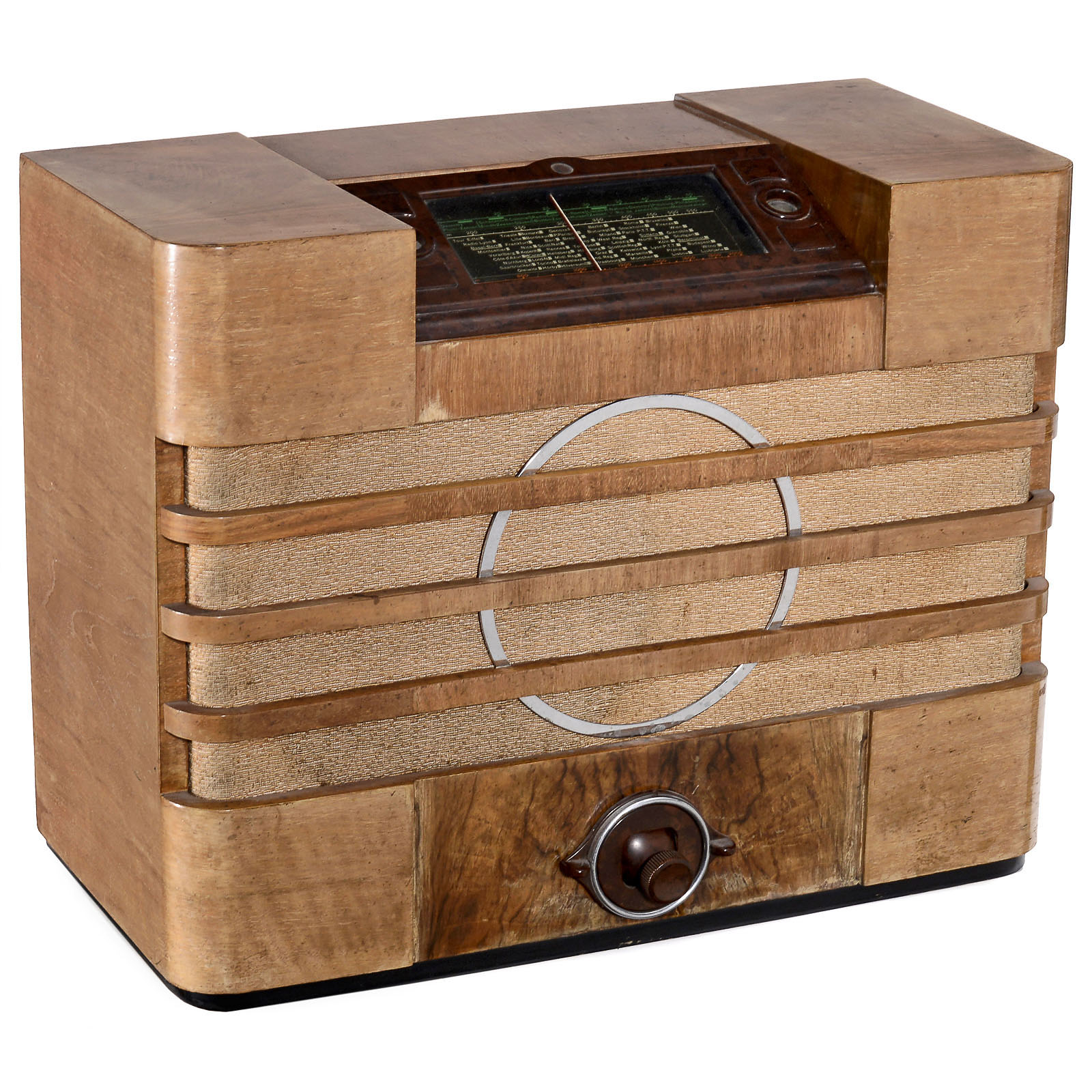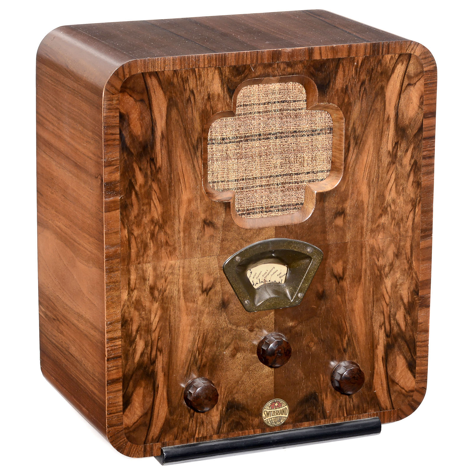 1) Philips type 796A, 6-valve mains receiver, "joystick" single-knob control, hinged scale, Germany, c. 1936. – And: 2) Switzerland R5, attractive wooden case, c. 1934.
