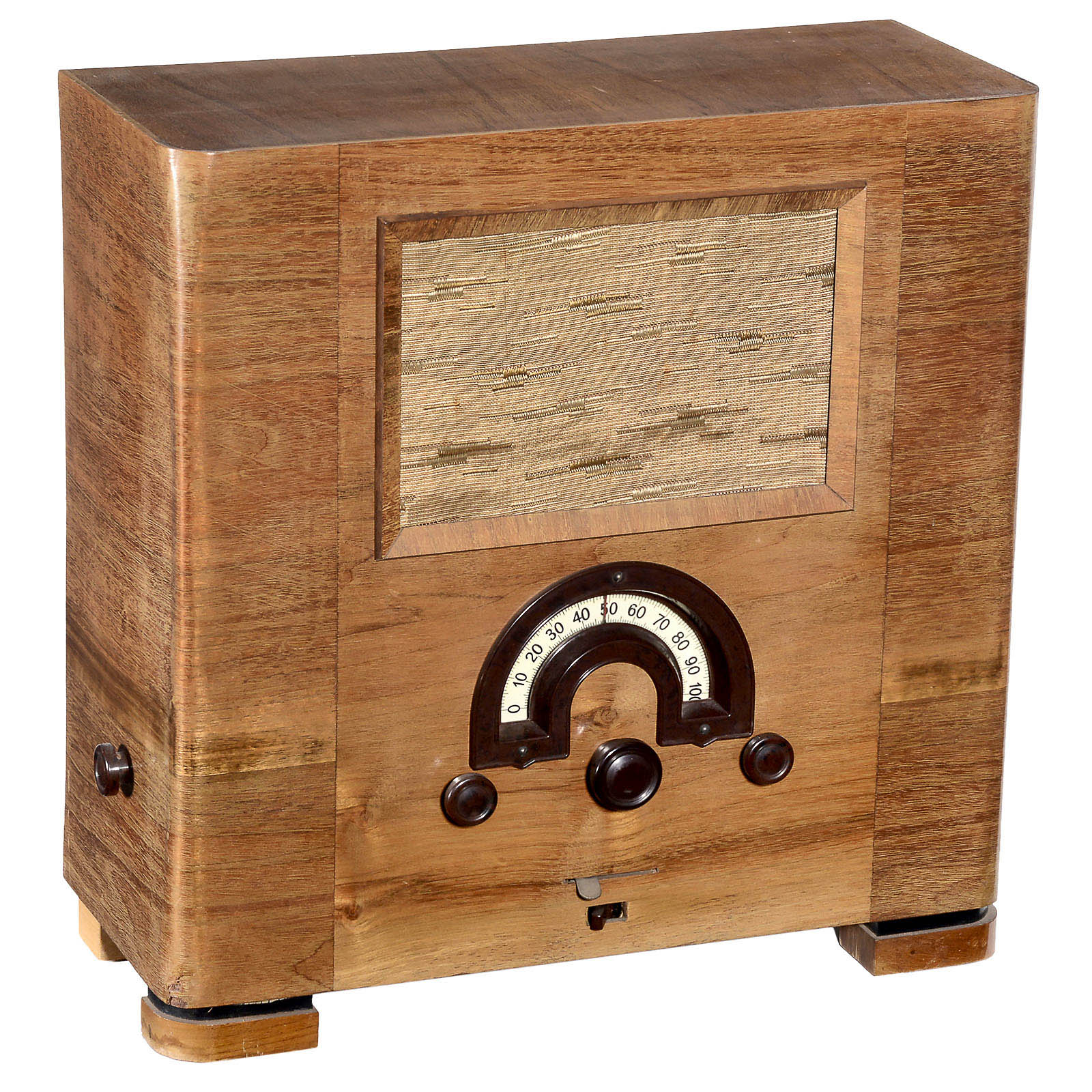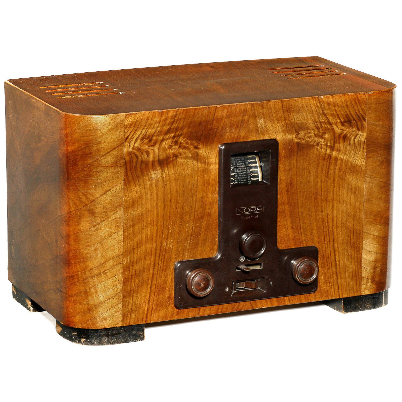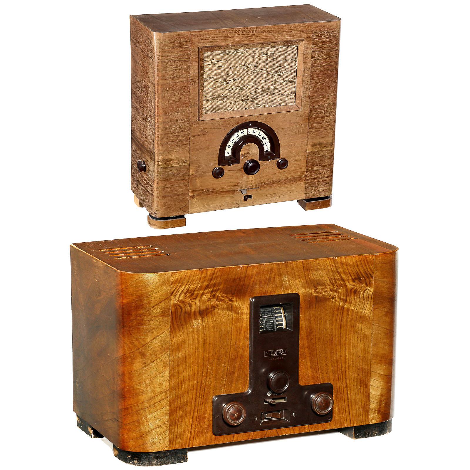 1) Nora type W500 radio, c. 1935, 7-valve superhet receiver, mains-operated, for external loudspeaker, wooden case with bakelite front. – And: 2) Schneider-Opel radio model 3DL, c. 1930, 3-valve receiver, wooden case, 2 wave ranges, very rare!