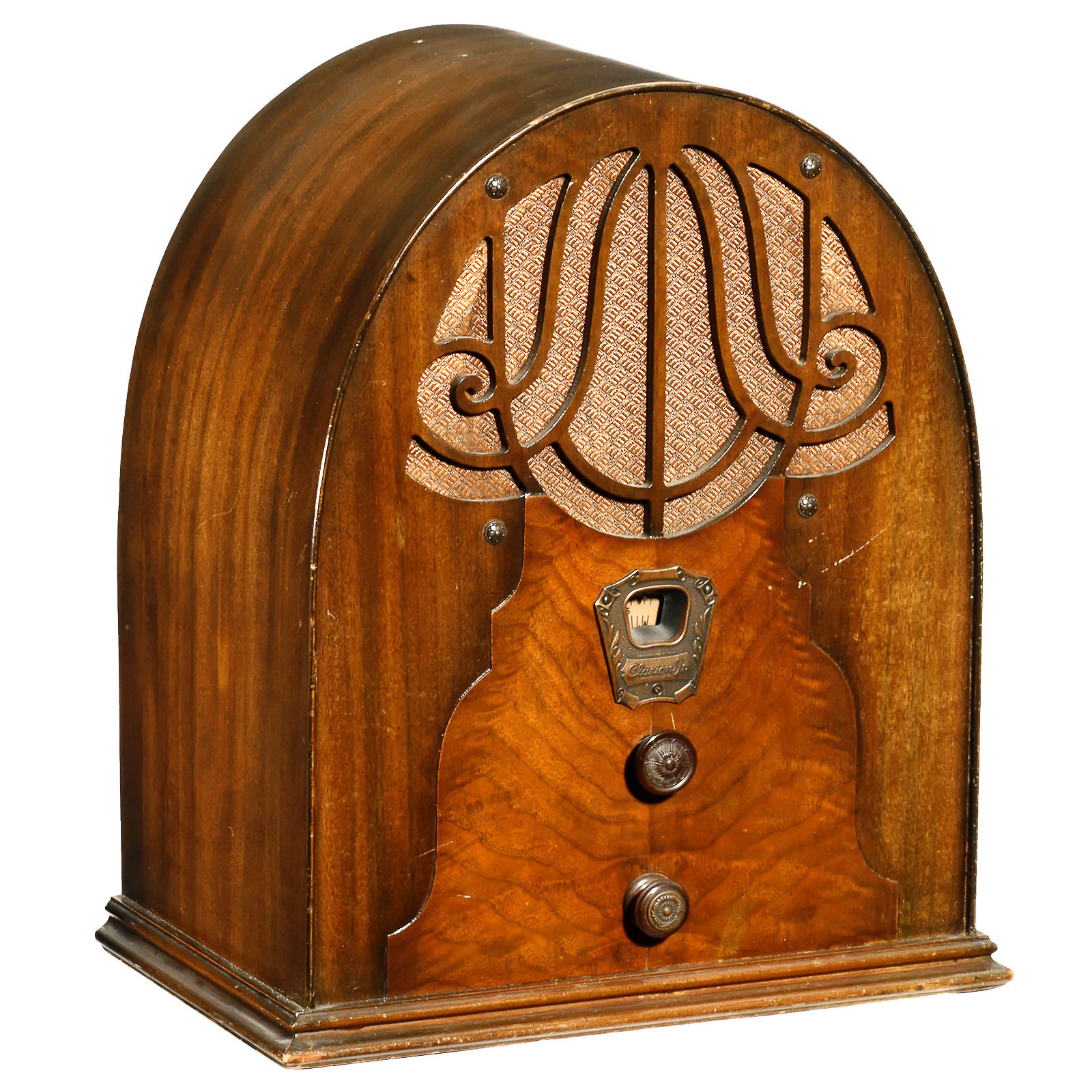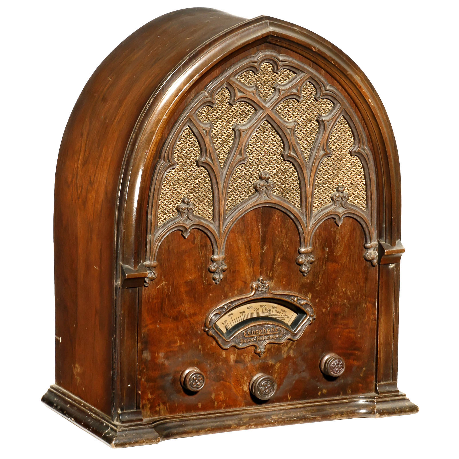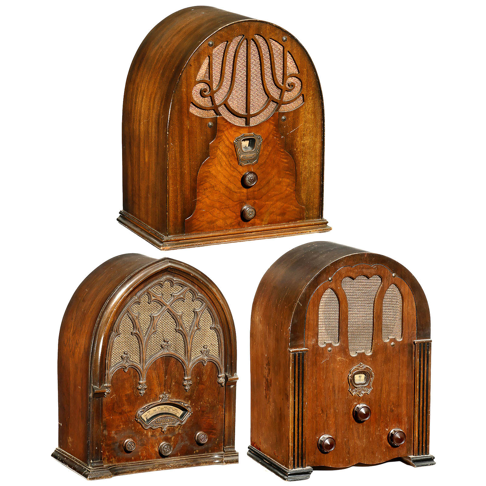 1) Echophone 80 cathedral radio, USA, 8-valve mains receiver, MW, wooden case. – 2) Crosley 125 cathedral radio, Crosley Radio Corp., USA, 5-valve mains receiver, MW, wooden case. – And: 3) Clarion cathedral radio model 40, 5-valve mains receiver, wooden case.