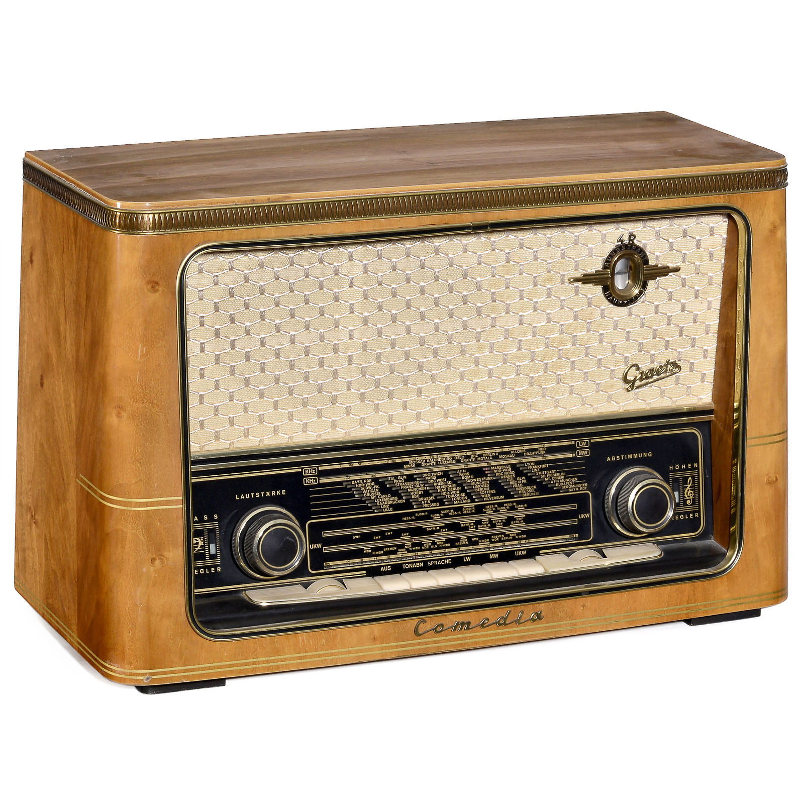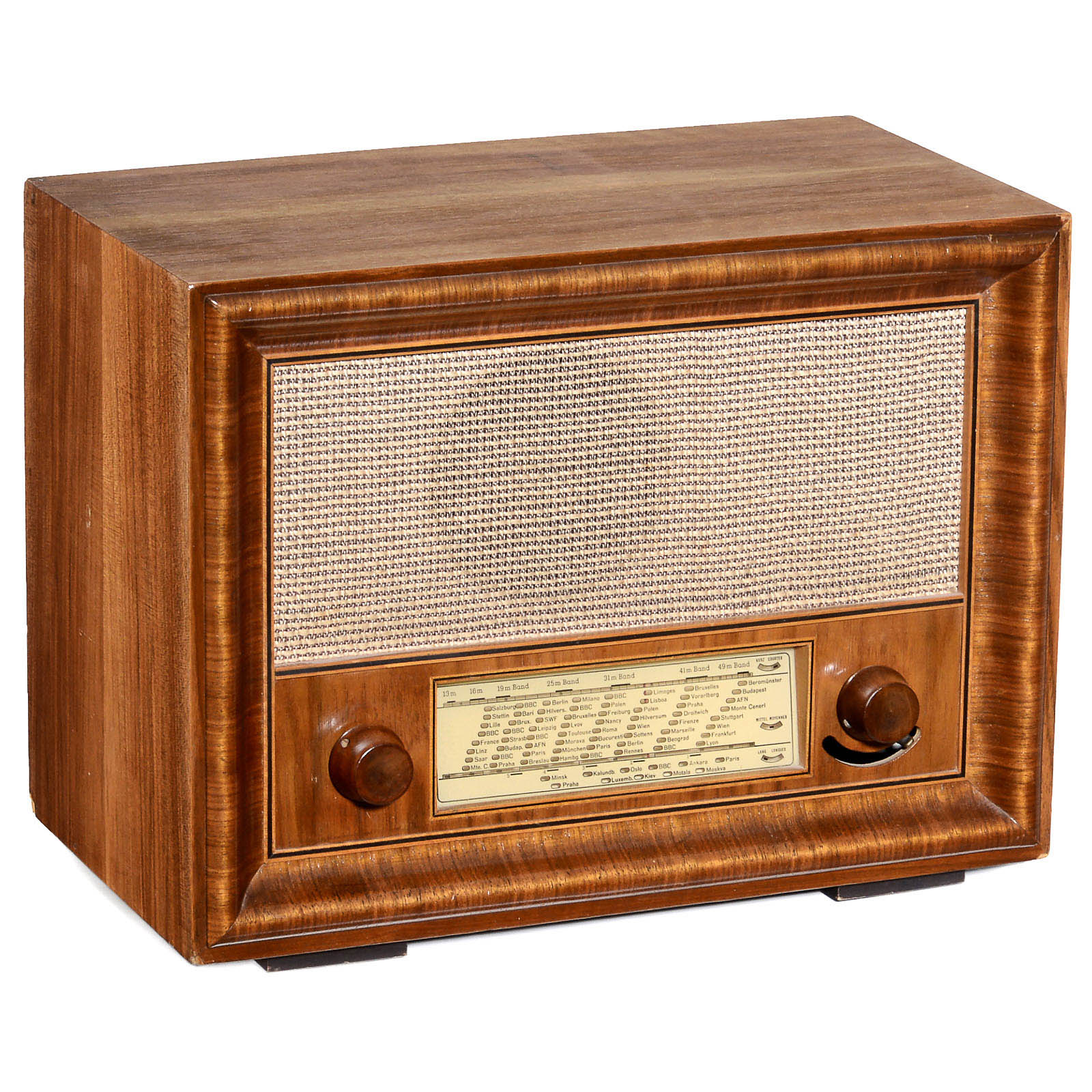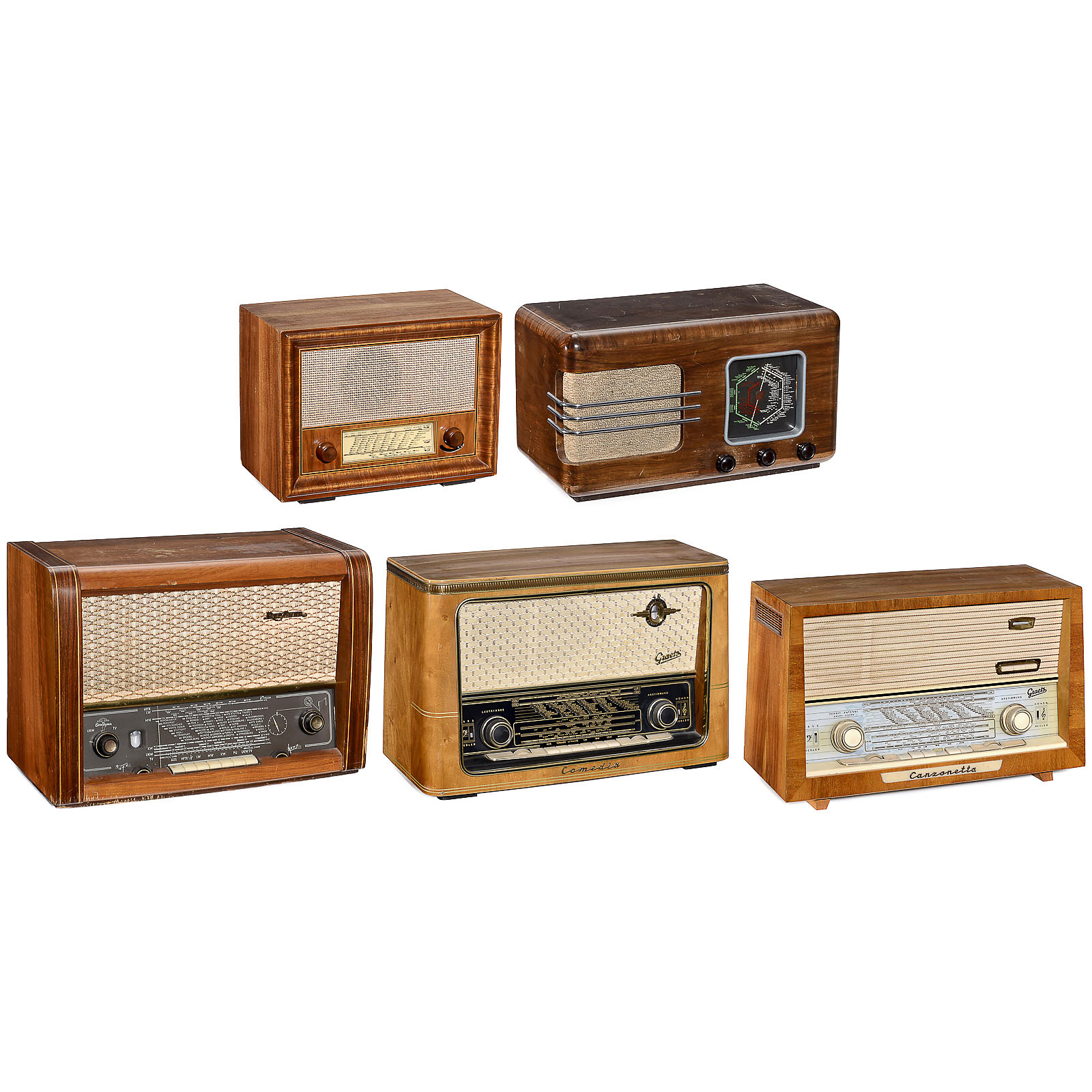 1) Graetz Comedia 4R/416, Germany, all wave ranges. – 2) Sondyna Resonar RE5520, Switzerland, all wave ranges. – 3) Autophon Champion 39, Switzerland, LW, MW and SW. – 4) Albis 442D, Switzerland, LW, MW and SW. – 5) Graetz Canzonetta 615, Germany, all wave ranges. – And: 6) Antenna table (not pictured).