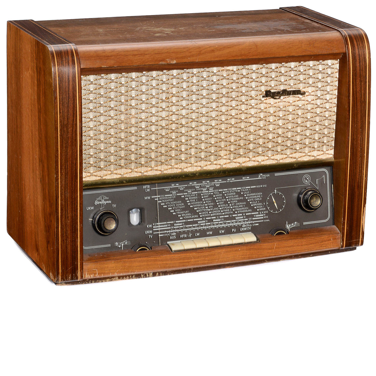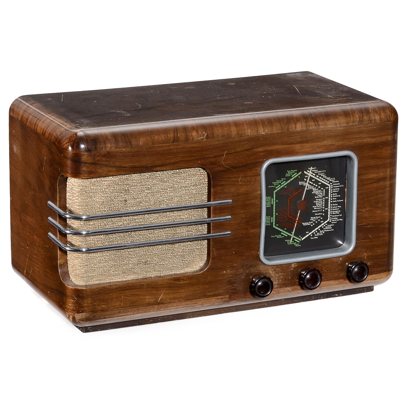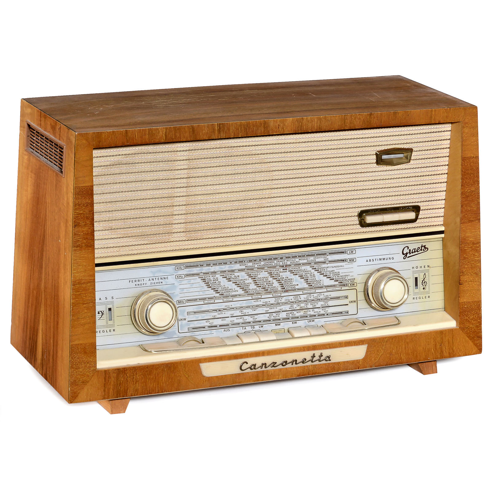 1) Graetz Comedia 4R/416, Germany, all wave ranges. – 2) Sondyna Resonar RE5520, Switzerland, all wave ranges. – 3) Autophon Champion 39, Switzerland, LW, MW and SW. – 4) Albis 442D, Switzerland, LW, MW and SW. – 5) Graetz Canzonetta 615, Germany, all wave ranges. – And: 6) Antenna table (not pictured).