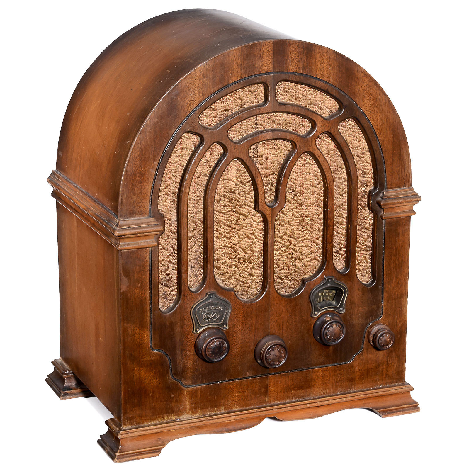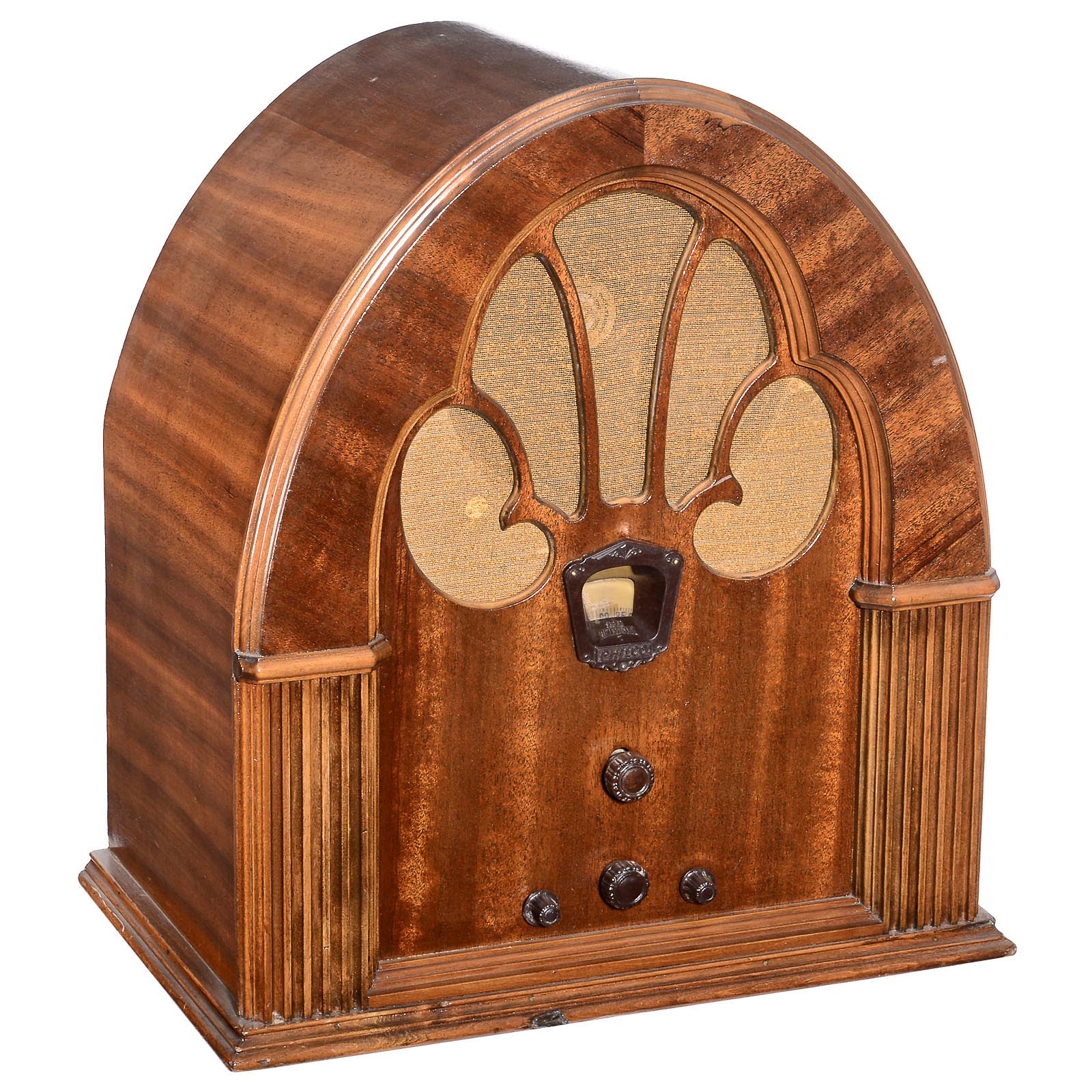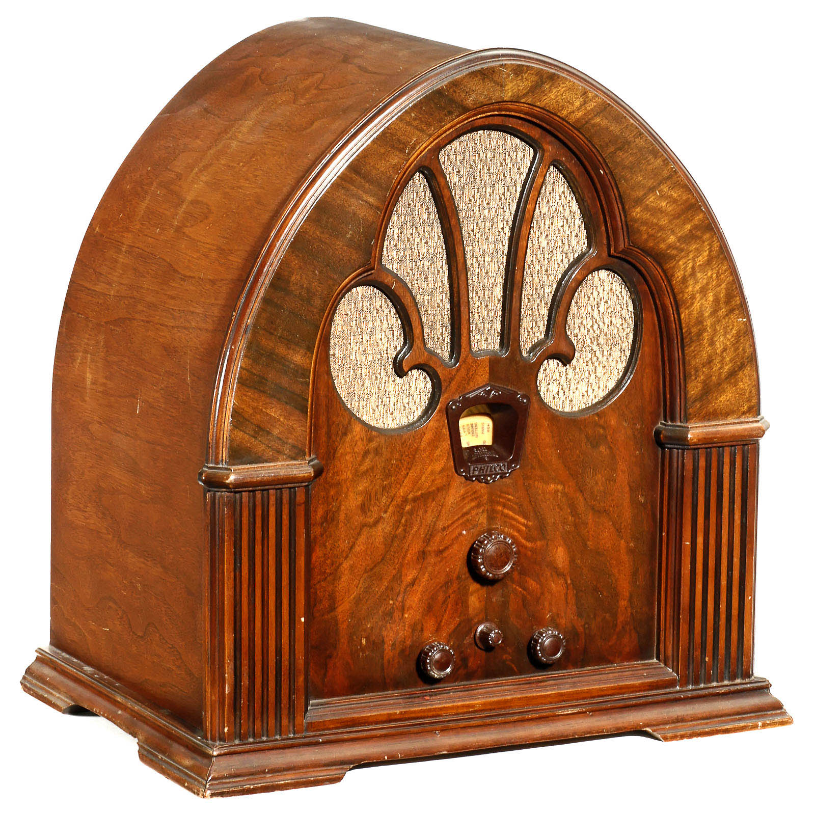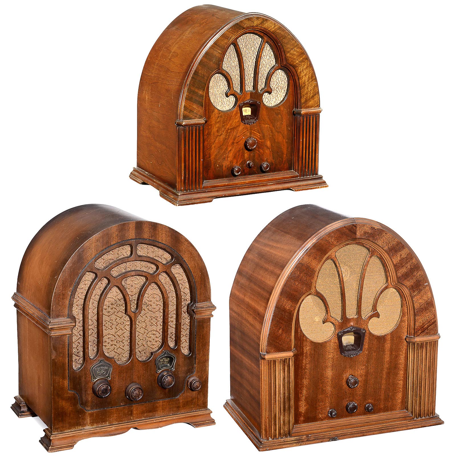 1) Crosley type Dual Fiver 167 radio, Crosley Radio Corp., Cincinnati, USA. 5-valve mains reveicer, dynamic loudspeaker, wooden cathedral cabinet, wooden knobs. – 2) Philco type 70 "Baby Grand" radio, Philadelphia, USA. 7-valve mains receiver, attractive cathedral cabinet. – 3) Philco cathedral model 90 F radio, 9-valve mains receiver.