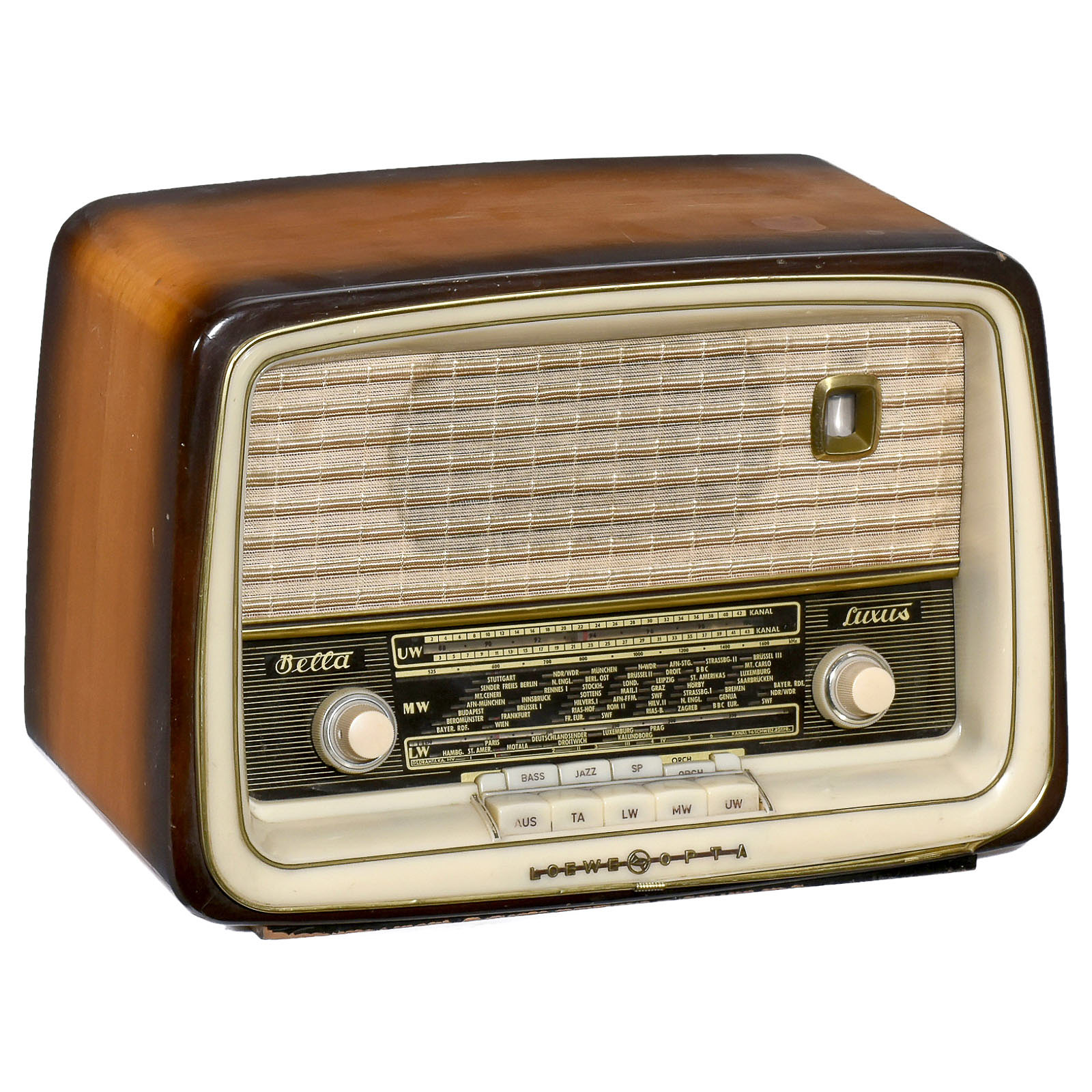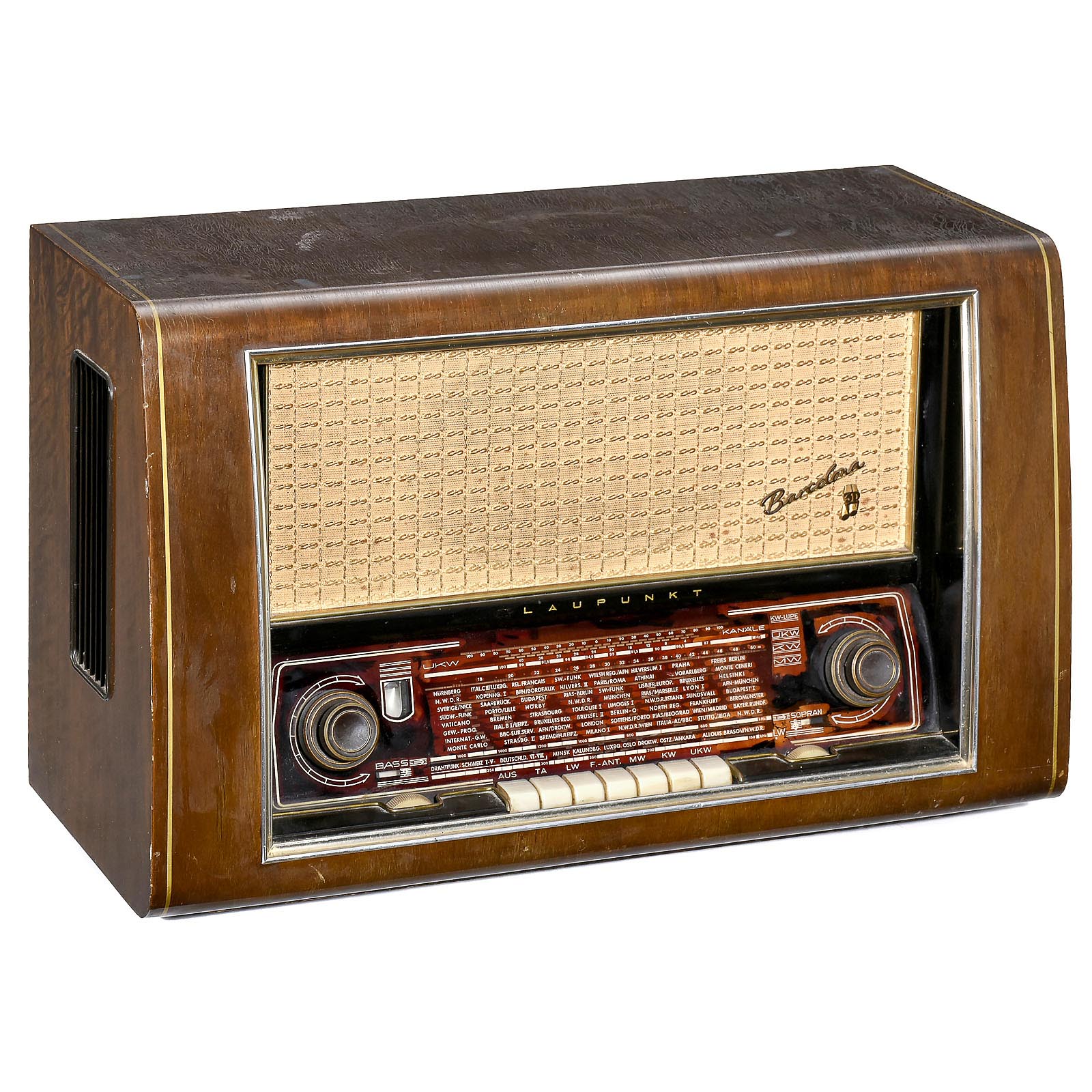 1) Neckermann WPR 9666 W, with record-player. – 2) Loewe Opta Bella-Luxus, type 4713 W. – 3) Blaupunkt Barcelona. – And: 4) Neckermann Triumph W 111/35 (Körting). – All radios complete with tubes, magic eyes, rear covers and mains wires. – In addition: Braun Audio 450 radio system with loudspeakers, c. 1968.