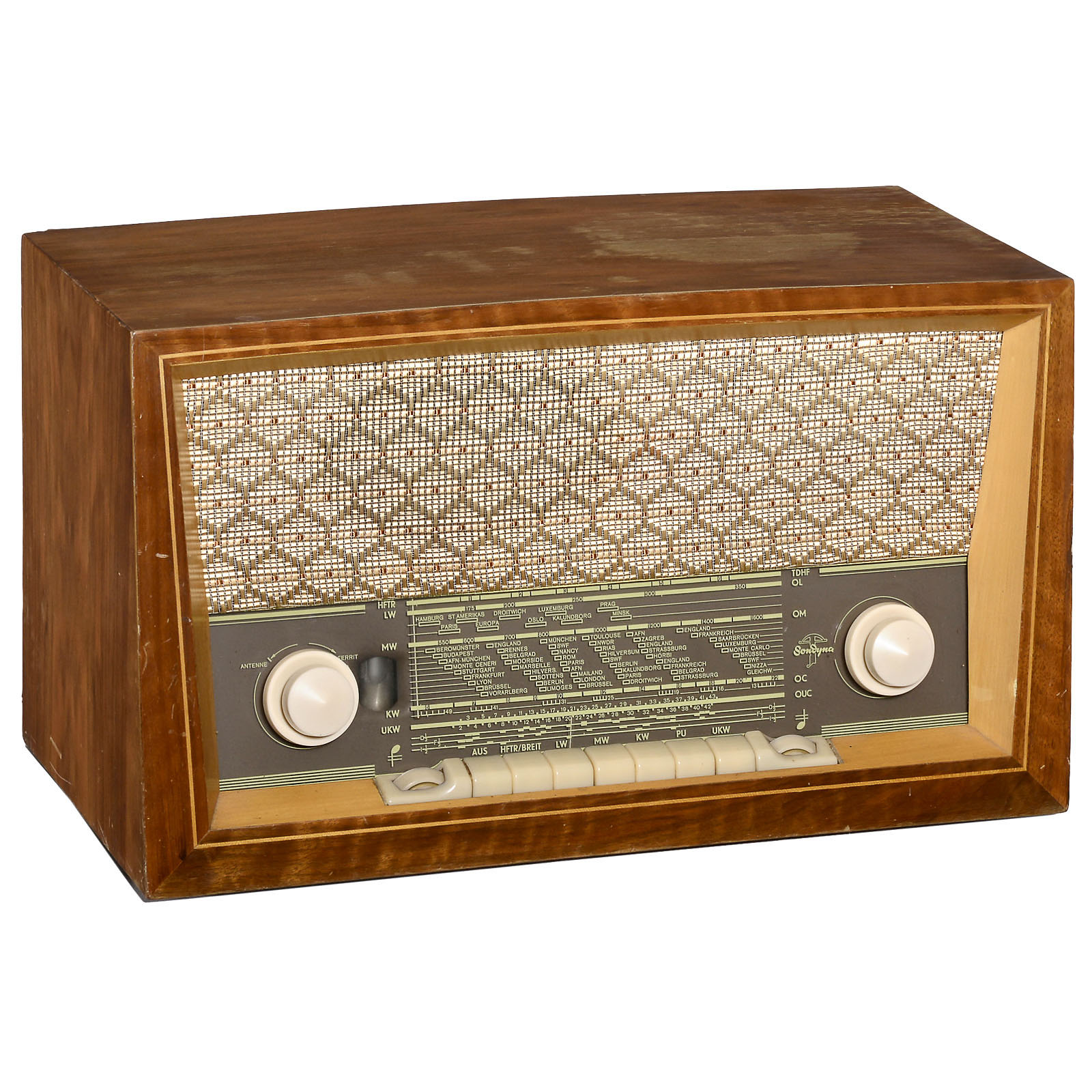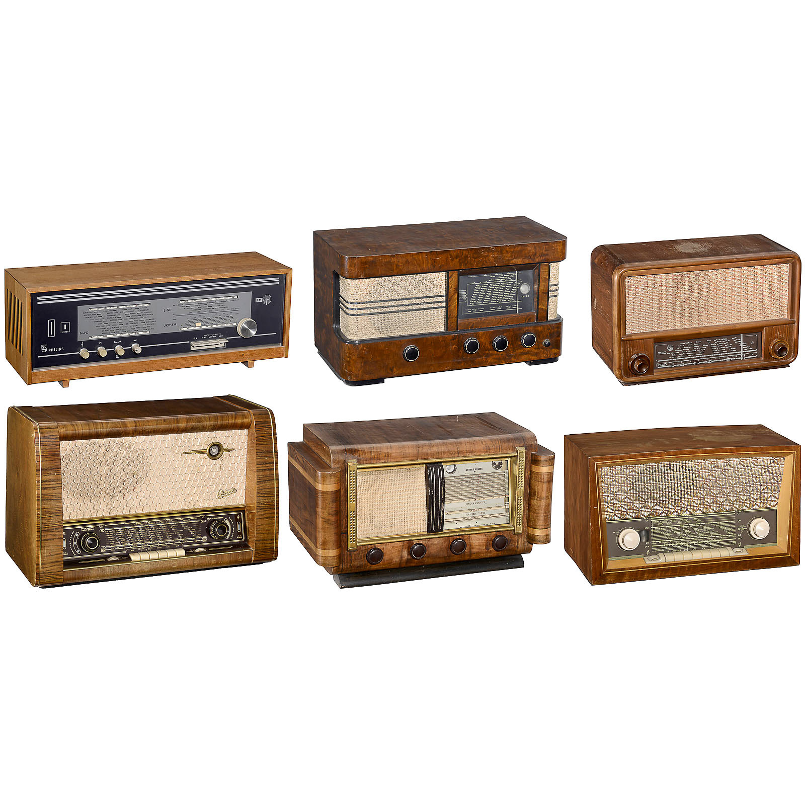 1) Radio-Meyer, France, type Bayard, 1948. – 2) Luxor Radio AB, Sweden, type 207WL, 1940. – 3) Sondyna AG, Switzerland, type Moderna E5815, 1958. – 4) Graetz, Germany, type 171W, 1953. – 5) Jura, Switzerland, type 215A2, 1945. – And: 6) Philips, Netherlands, type 03RB563/16, 1966.