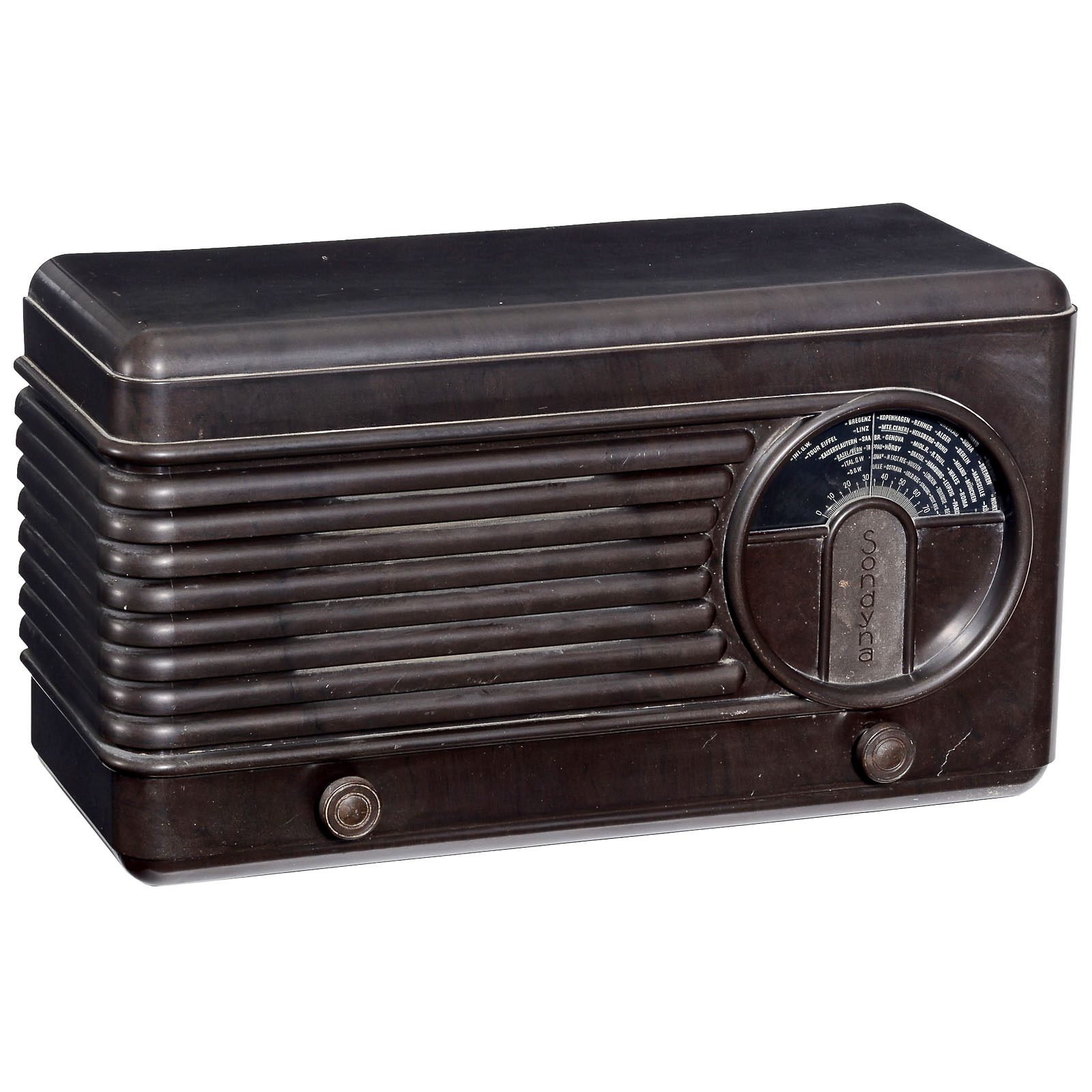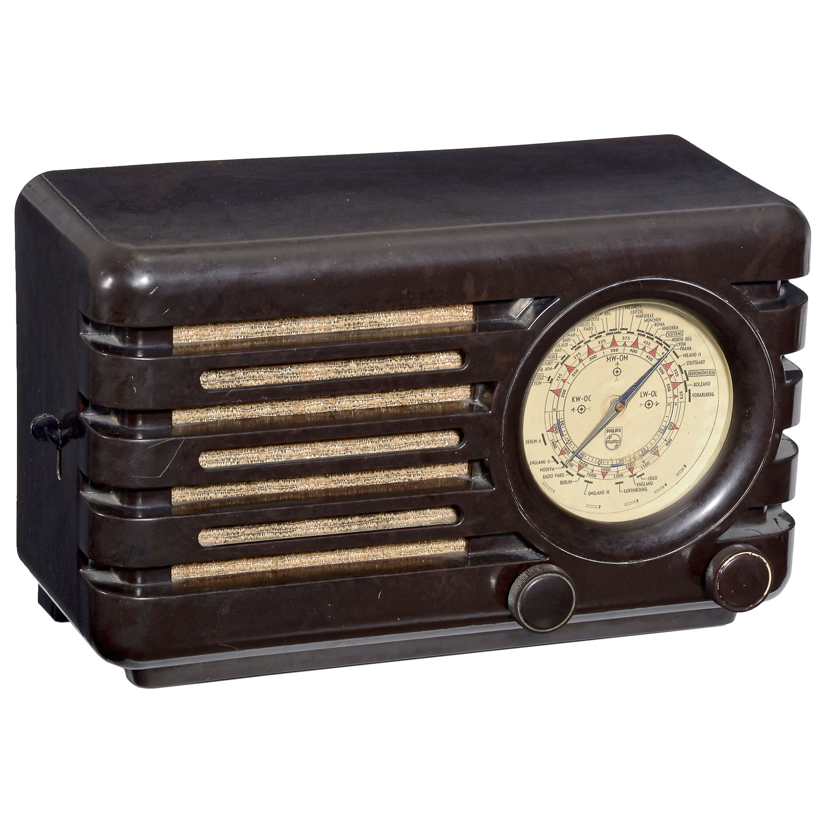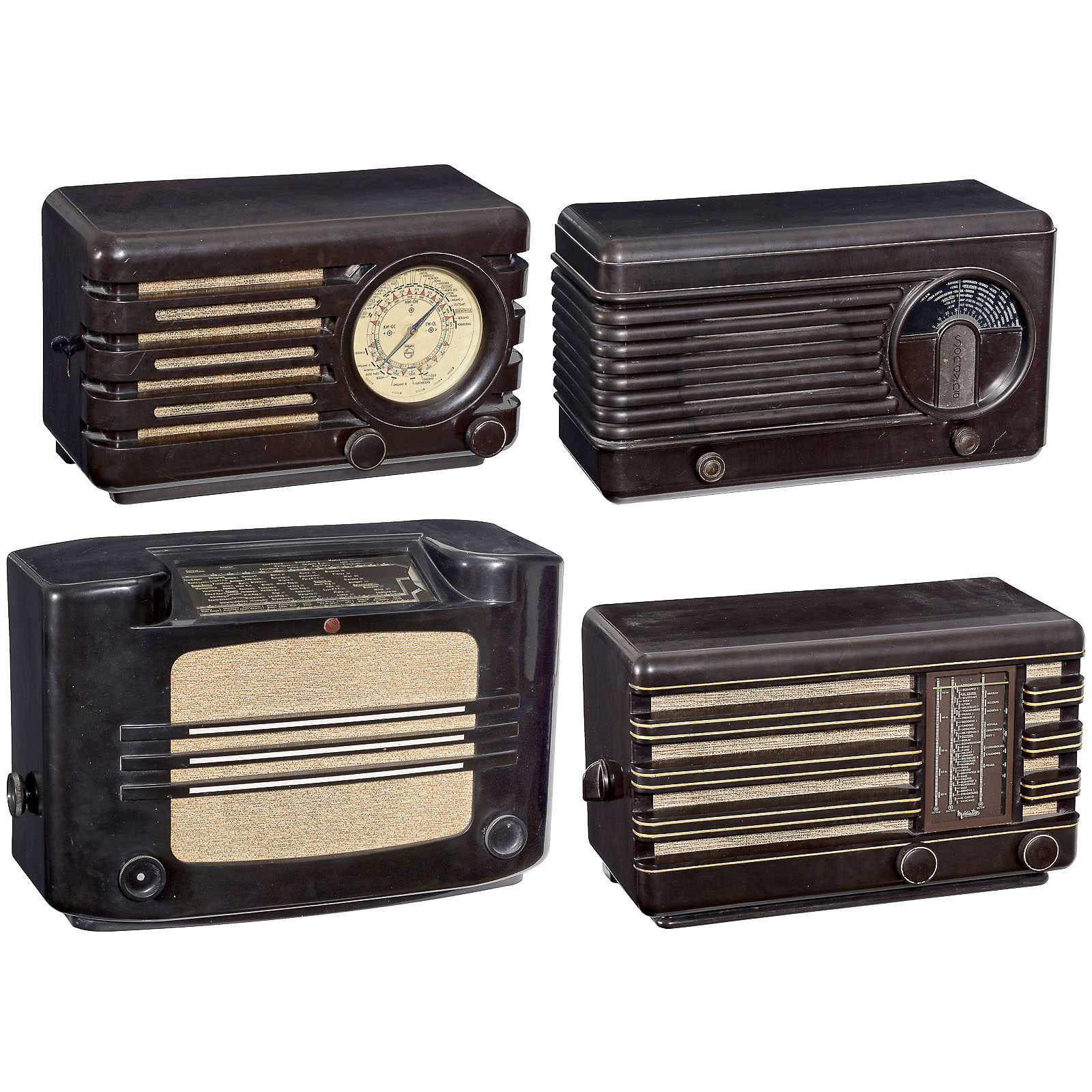 1) Philips type BCH 373A "Mariza", 3 wave ranges, c. 1946. – 2) Philips type M230A "Mediator", c. 1949. – 3) Sondyna "Volksempfänger" VE 40/41, medium wave, c. 1941. – And: 4) Philips type 461A "Menuetto", 3 wave ranges, c. 1937.