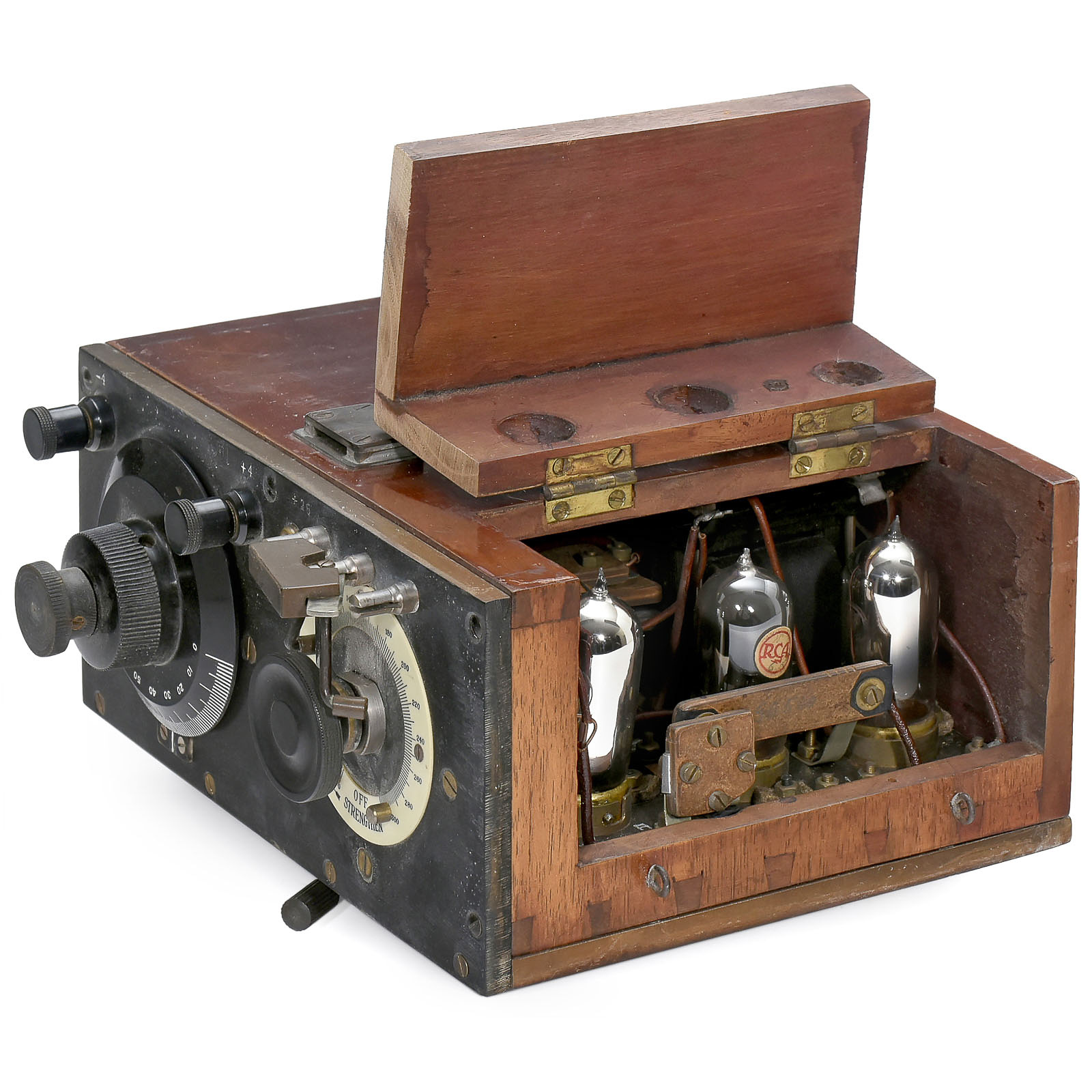 1) Amplifier (telephone?), with 5 Huth electron tubes (1 x RE50 and 4 x RE181, all filaments intact) and glass resistors, c. 1920. – And: 2) American receiver, portable, with 3 Radiotron-RCA UV199 tubes, c. 1925.