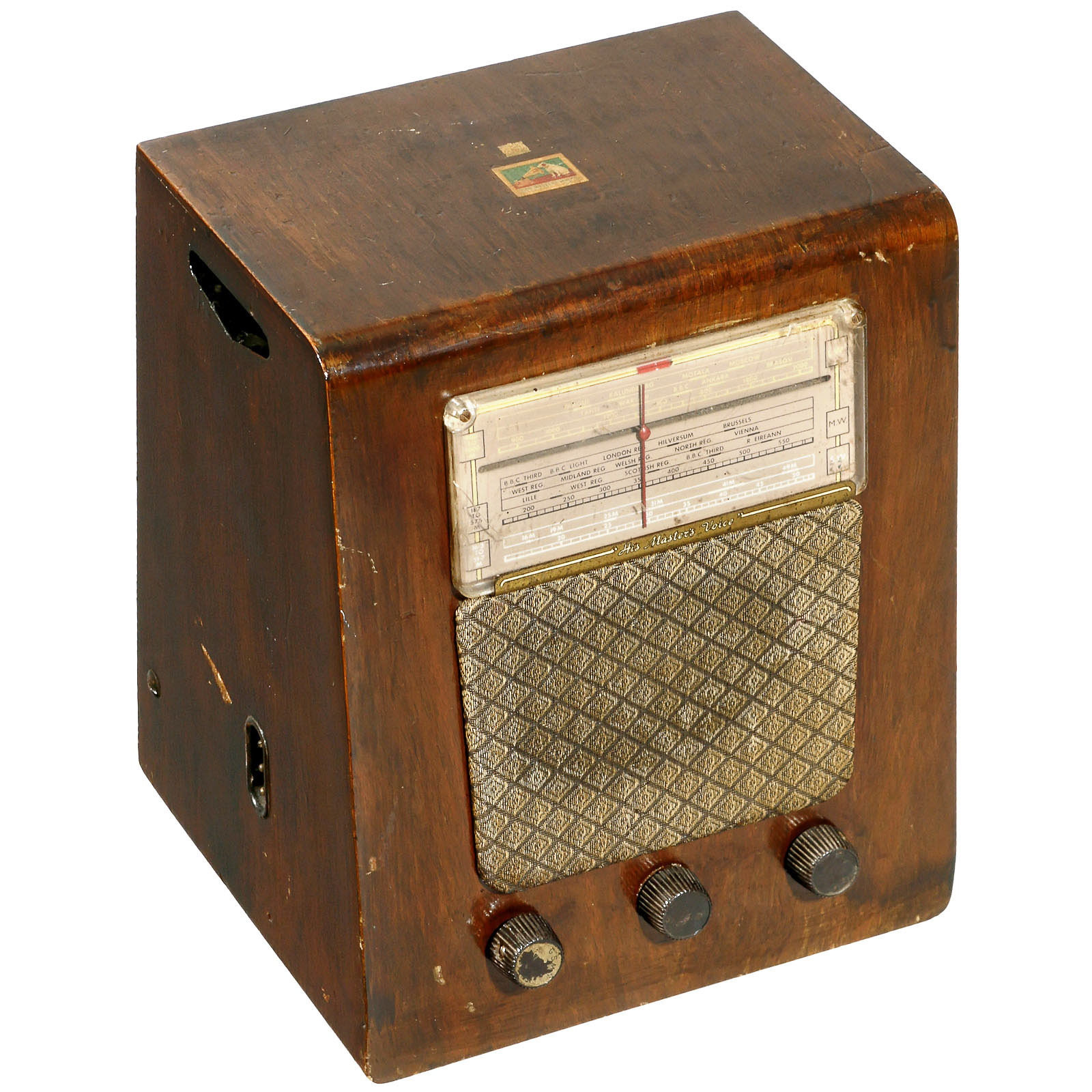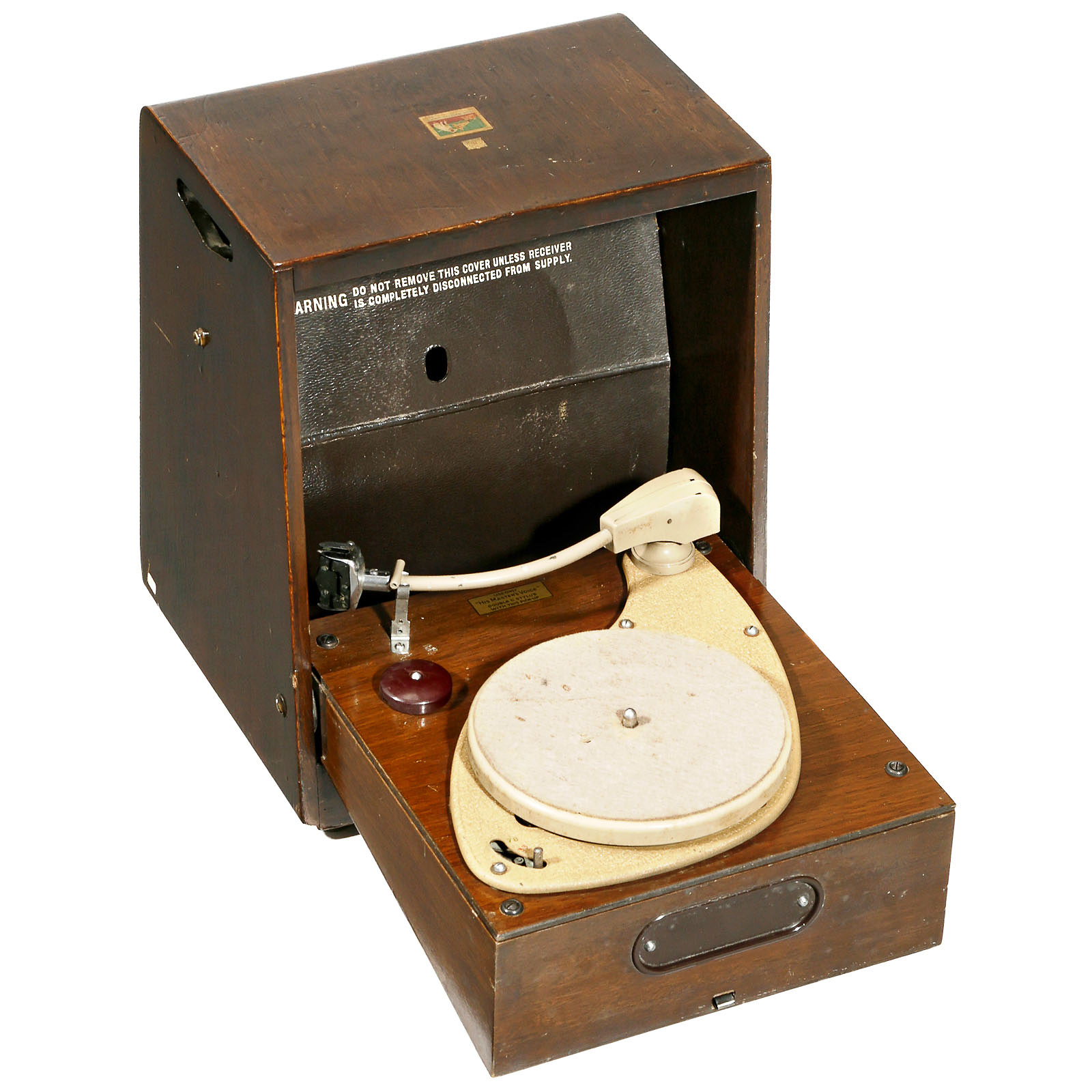 1) Murphy Radio Ltd., type A272C, 6-valve receiver in wooden floor case, size 24 x 31 x 8 ¾ in., MW, LW and FM. – And: 2) His Master's Voice, model 150B, KW, MW and LW, reverse with folding record player.