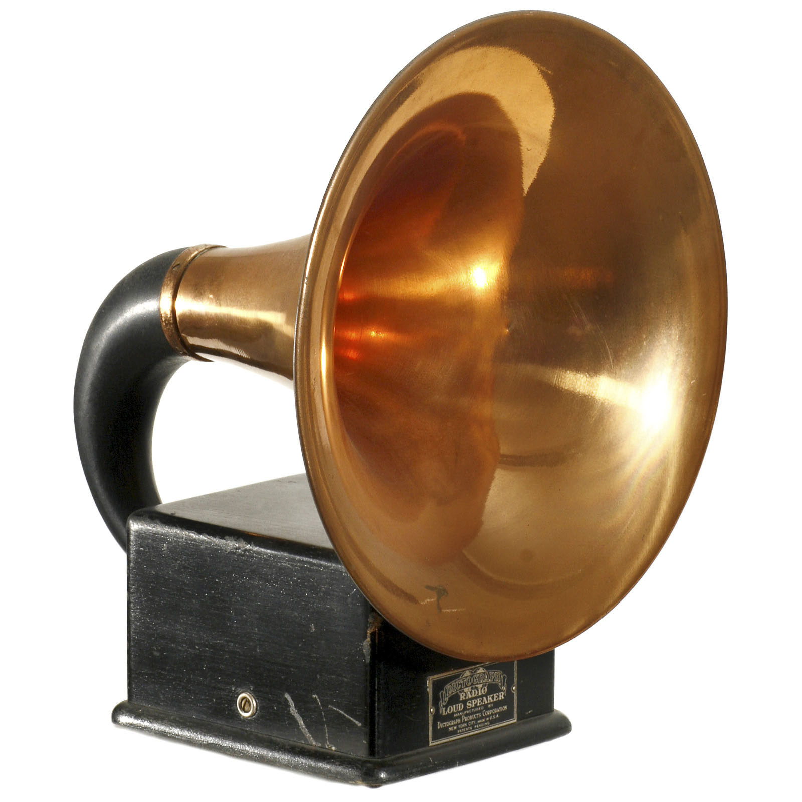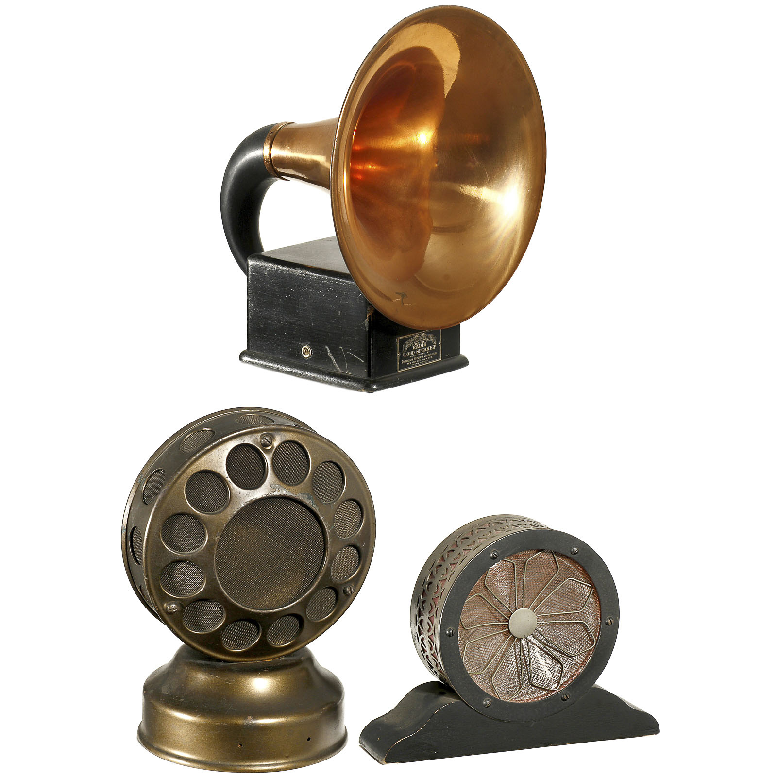 1) Portable horn-type "Dictograph" loudspeaker, USA, c. 1924. – 2) Microphone loudspeaker by Kodel Radio Corporation, USA, c. 1925. – And: 3) Moving iron "Beco" loudspeaker, Britain, c. 1924.