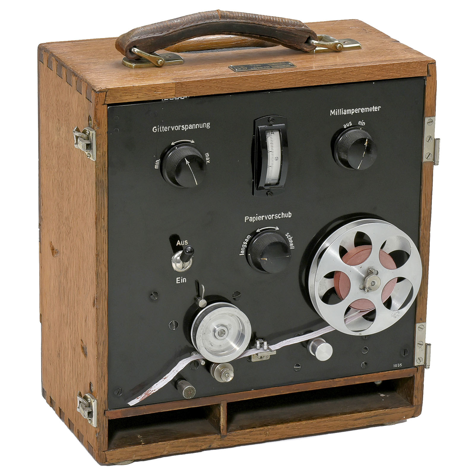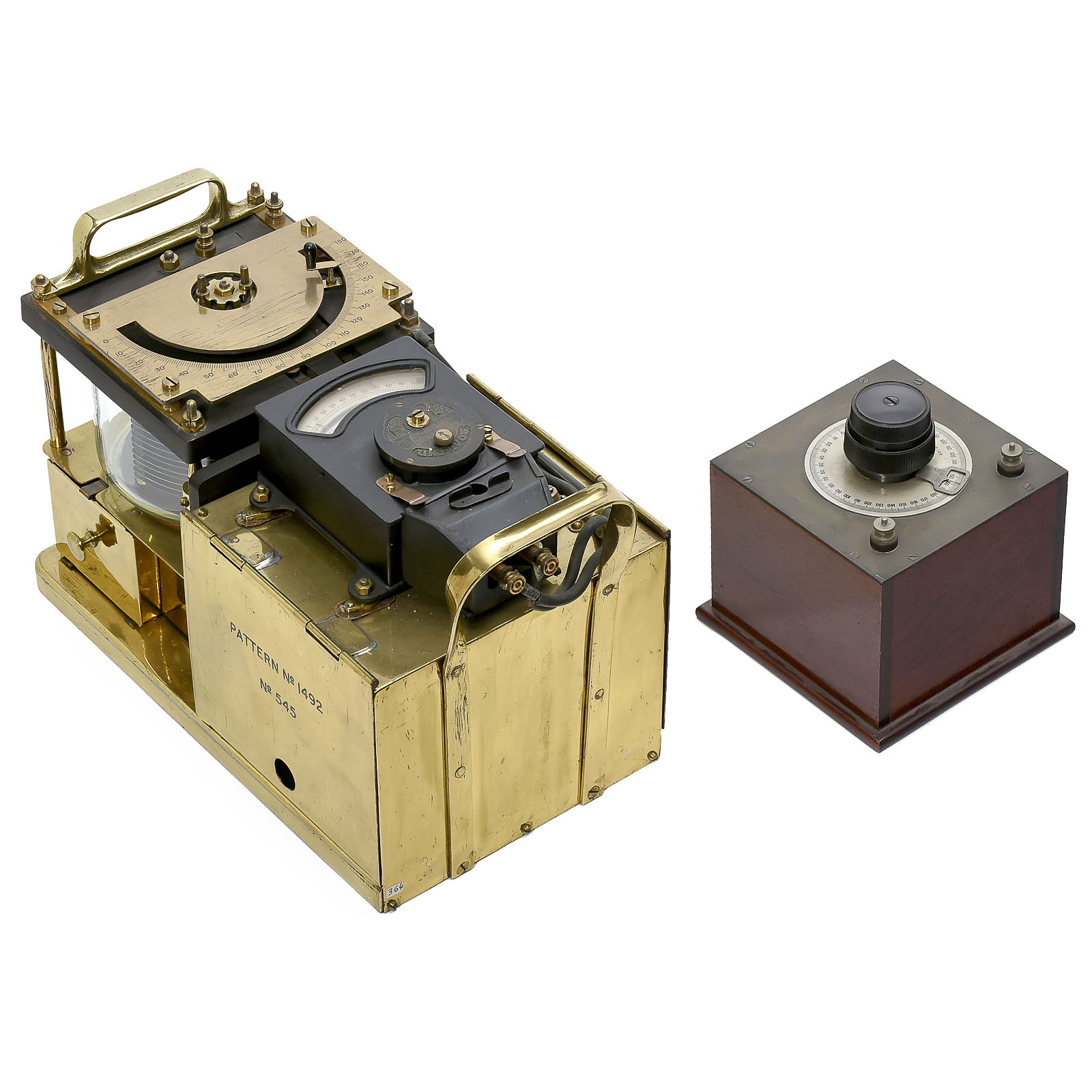 1) Pulse-recorder by Hasler AG./Bern; type 2173, c. 1933, used to record dialing pulses. – 2) English variable capacitor, patent no. 15548/26, c. 1925. – And: 3) English wavemeter with galvanometer, pattern no. 1492, with large glazed variable capacitor.