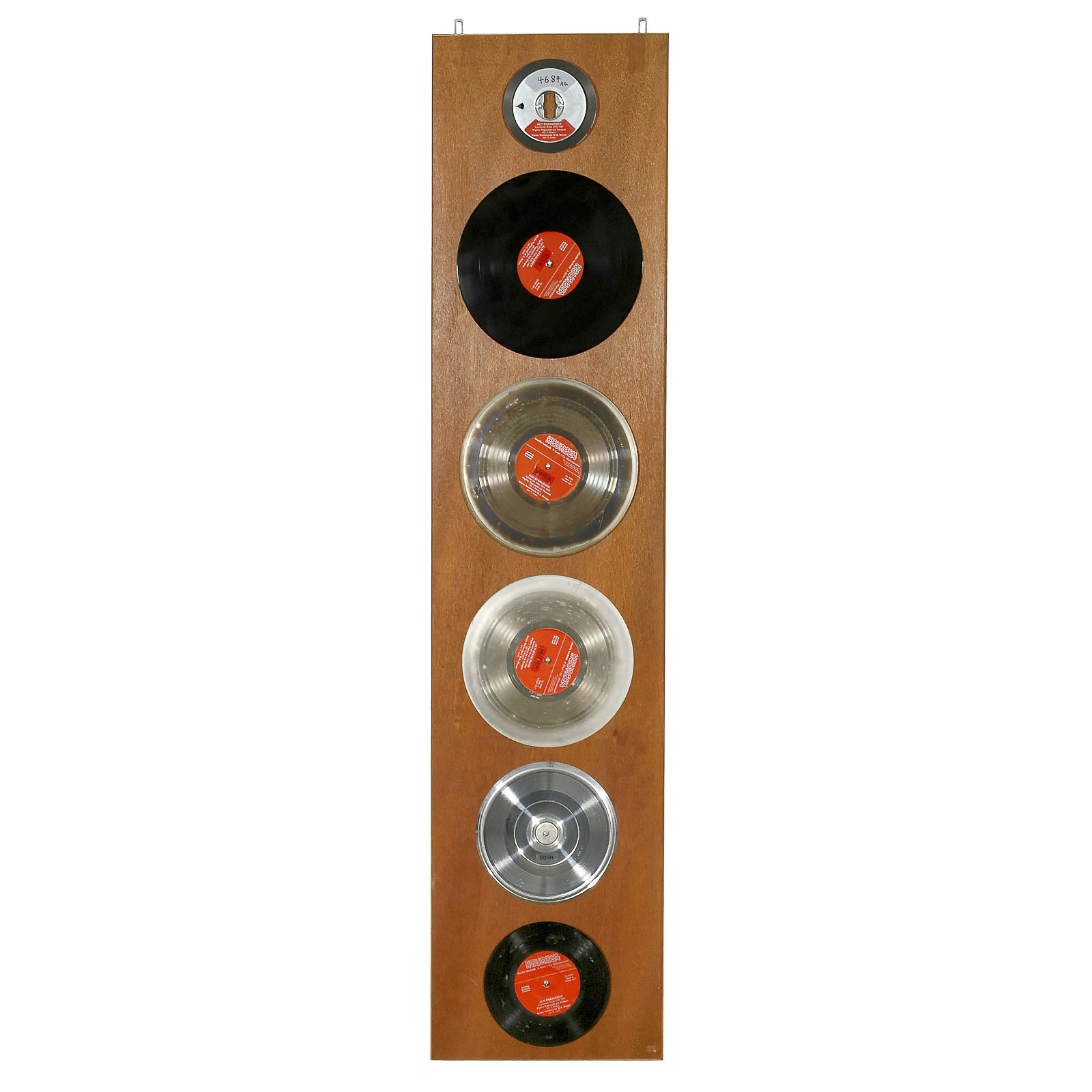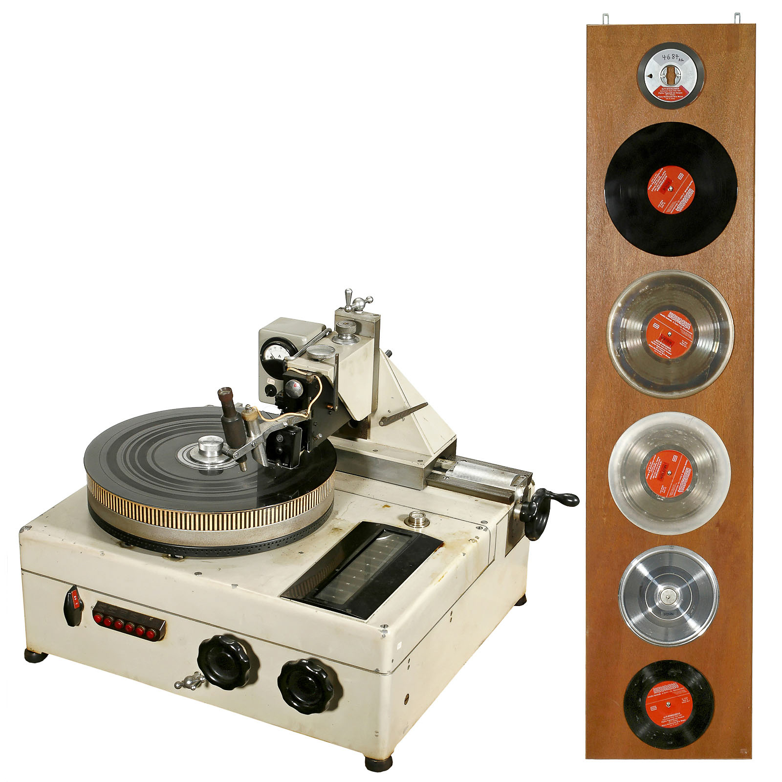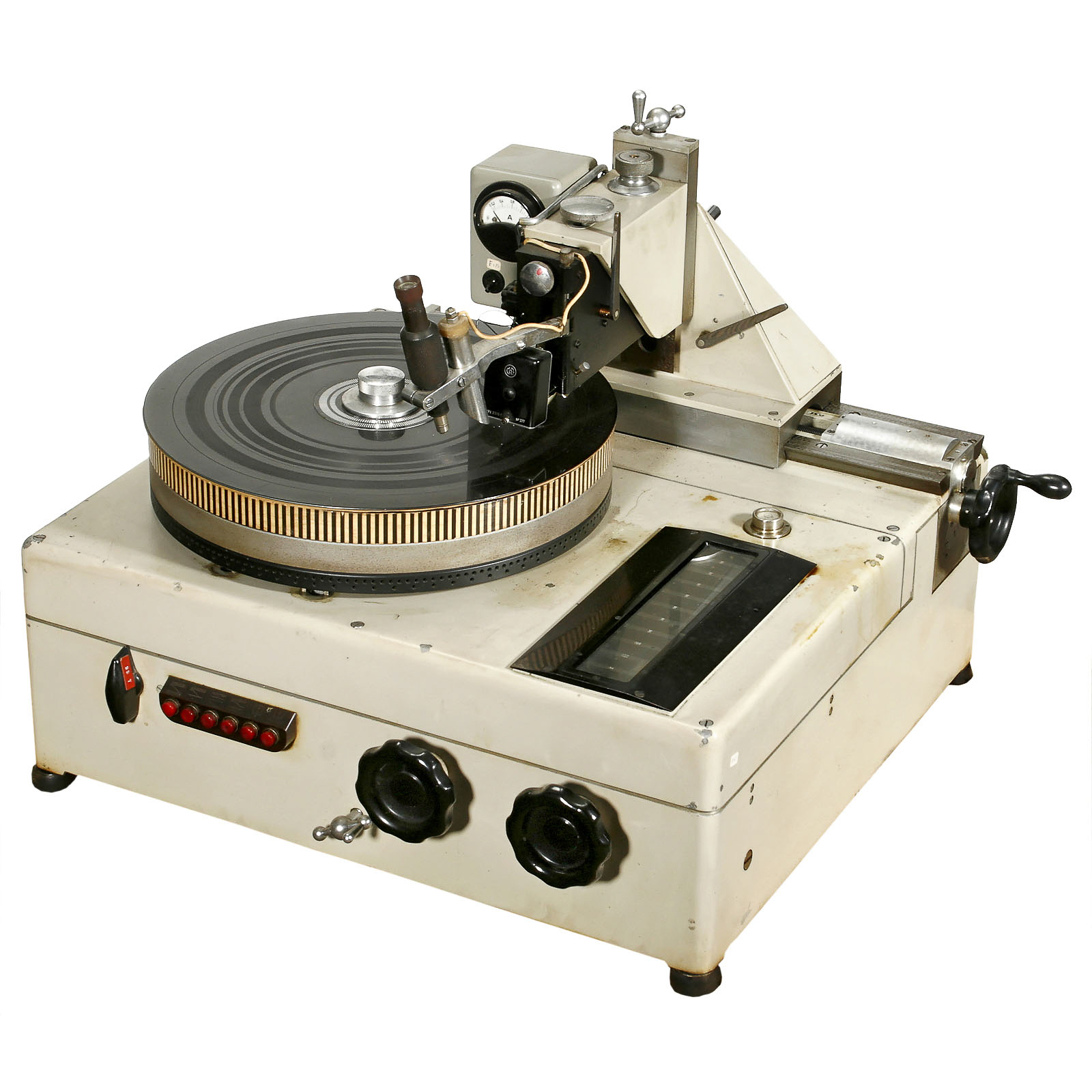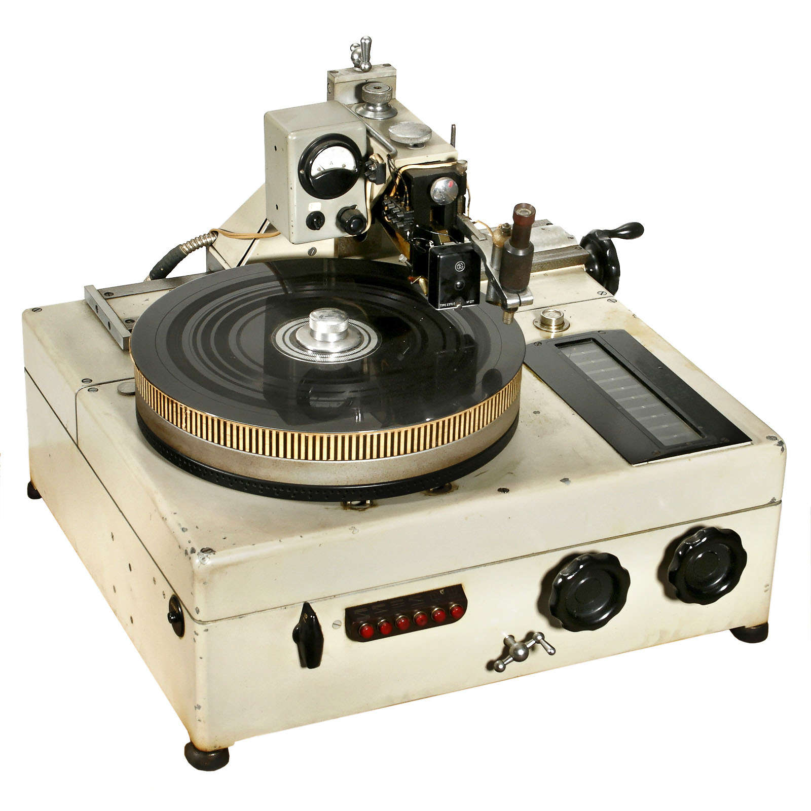 Manufactured by Motosacoche, Geneva, Switzerland. Machine type B, no. 126, with cutter head type 2370C, a very heavy and solid construction. – In addition: Display: "From the tape to the single disc".