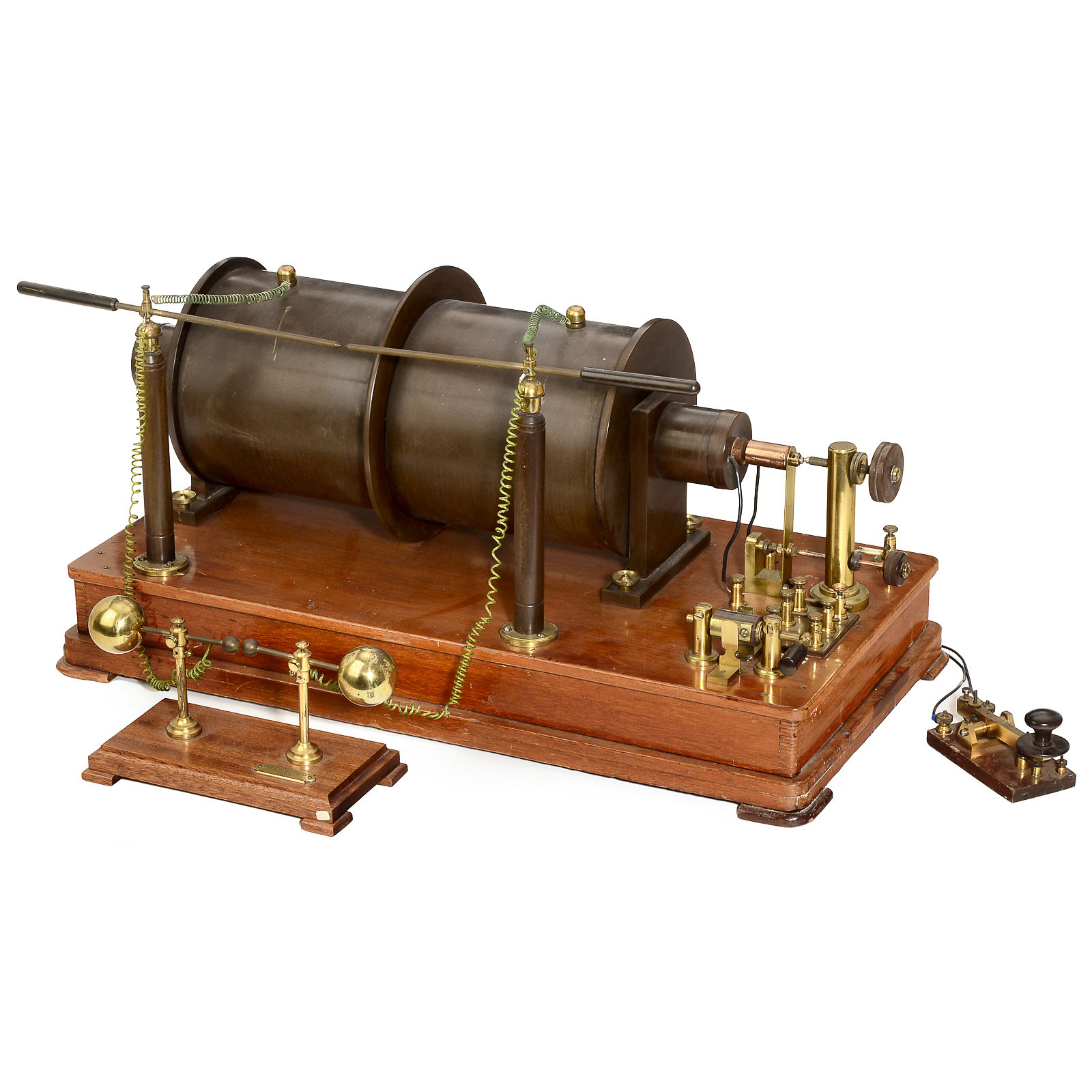 1) Spark gap transmitter, English, probably made by Newton & Co., for sparks up to 2 in., width of the coil 24 ½ in. – 2) Hertz oscillator (replica). – And: 3) English Morse key.