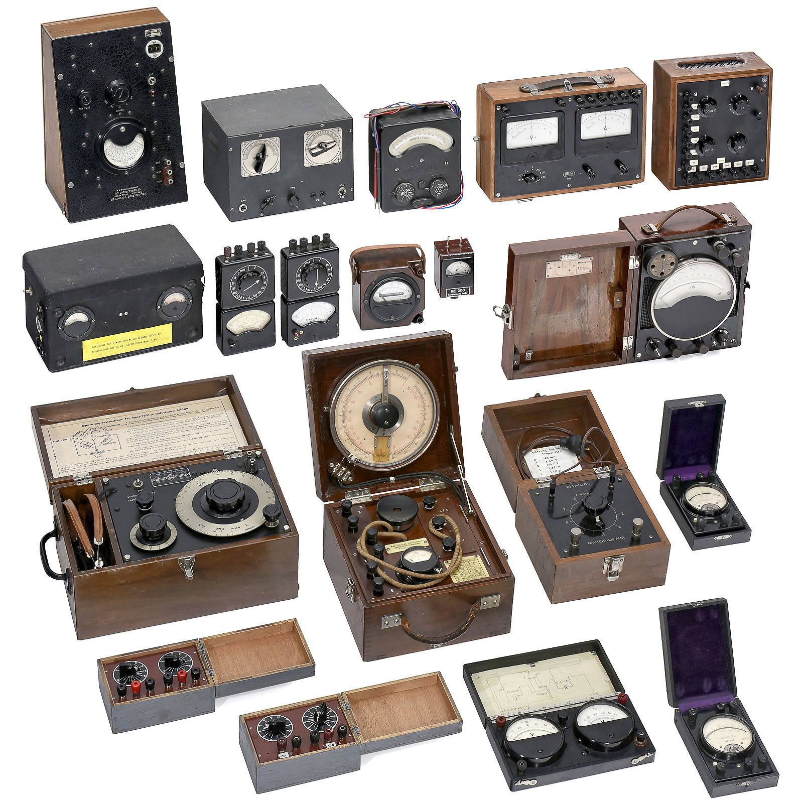 Voltmeter, amperemeter, voltage regulators and tuning instruments with headphones.