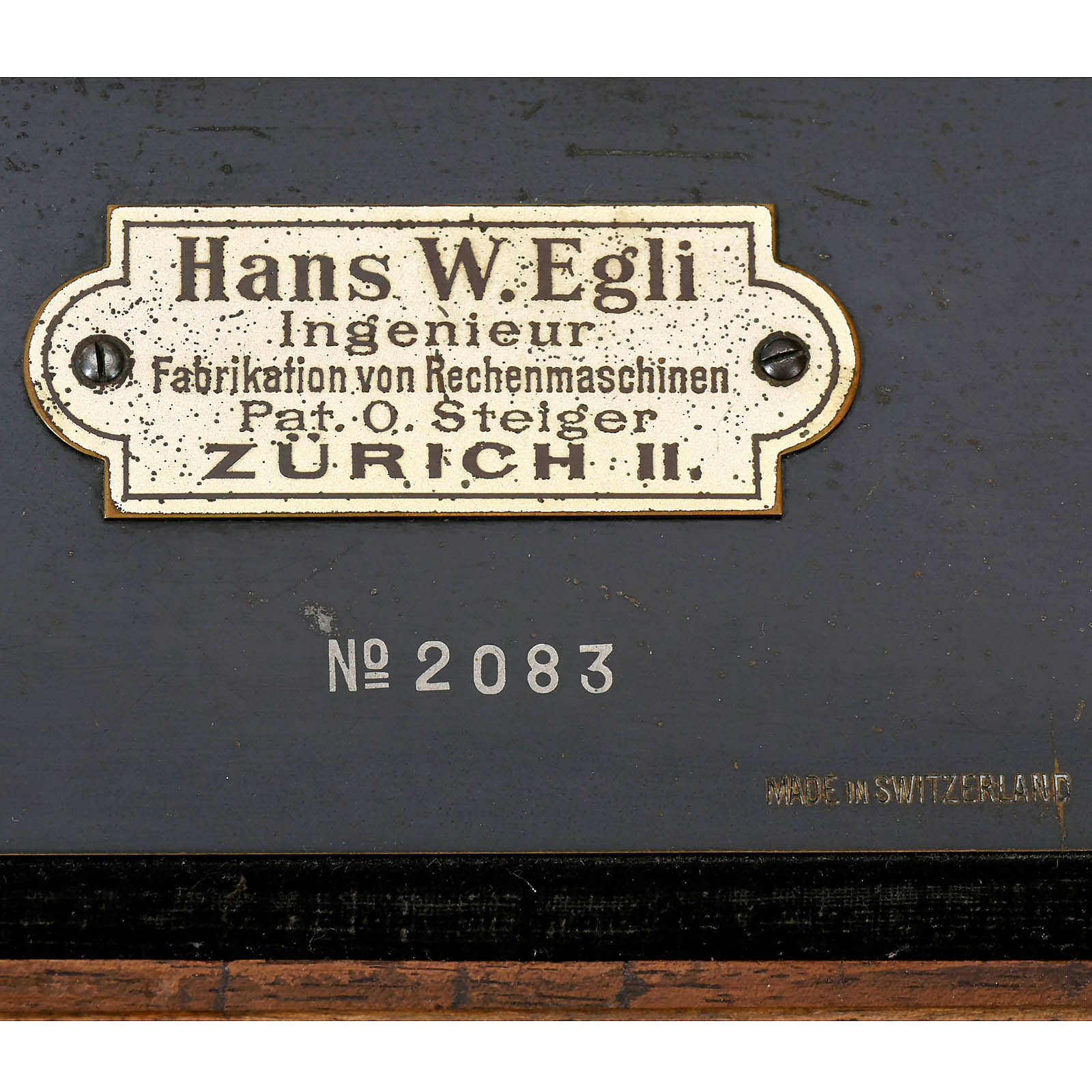 Early model of the famous calculating machine, in original wooden case, with serial no. 2083. – A very rare, decorative milestone in calculator history!