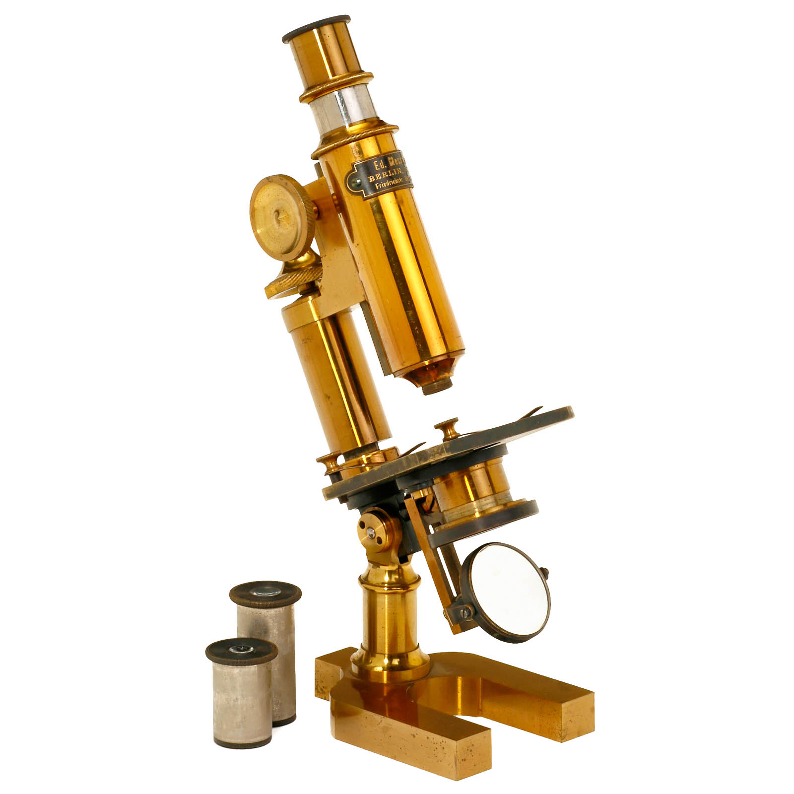 Signed on 2 plaques (case and tube): "Ed. Messter, Berlin N.W., Friedrichstr. 94 u. 95", original lacquered brass, double-mirror, iris diaphragm with condenser, coarse and fine adjustment, 3 eyepieces, no objective, height 12 ¼ in., in fitted mahogany case.