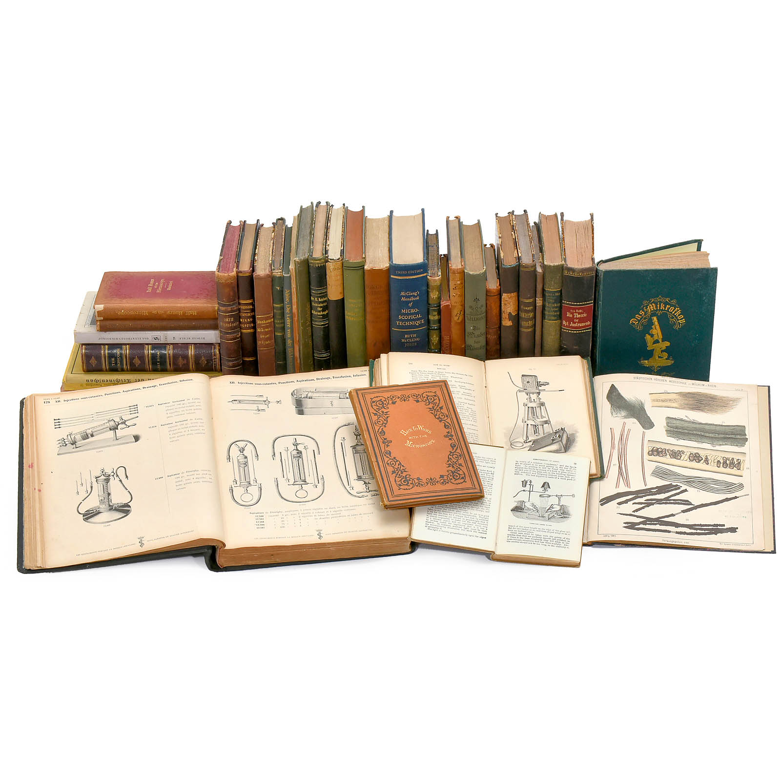 Jabez Hogg, "The Microscope", London 1859; Dr. Heinrich Frei, "Das Mikroskop", Leipzig 1873; Dr. Giulio Bizzozero, "Handbuch der klinischen Mikroskopie", Erlangen 1887; Lionel S. Beale, "How to Work with the Microscope", London 1865; Martin J. Cole, "Modern Microscopy", London 1903; Dr. Ludwig v. Thanhoffer, "Das Mikroskop und seine Anwendung", Stuttgart 1880; Rudolf Rühle, "Das Elektronen Mikroskop", Linz 1949; Dr. Julius Vogel, "Das Mikroskop", Berlin 1877; M. von Rohr, "Die Theorie der optischen Instrumente", Berlin 1904; Dr. Arthur Meyer, "Die Grundlagen und die Methoden für die mikroskopische Untersuchung von Pflanzenpulvern", Jena 1901; Dr. Carl Mez, "Das Mikroskop und seine Anwendung", Berlin 1904; Dr. Paul Heine, "Leitfaden der Trichinenschau", Hanover 1927; Dr. Moritz Willkomm, "Die Wunder des Mikroskops", Leipzig 1896; Dr. Julius Wiesner, "Einleitung in die technische Mikroskopie", Vienna 1867; Dr. Johannes Orth, "Cursus der normalen Histologie", Berlin 1884; Dr. Carl Friedlaender, "Microscopische Technik", Berlin 1884; Dr. Ferdinand Hueppe, "Die Methoden der Bakterien-Forschung", Wiesbaden 1886; Dr. Gustaf von Düben, "Leistungen des Mikroskops", Würzburg 1858; Edwin Lankester, "Half-Hours with the Microscope", London 1880; Thomas Davies, "The Preparation & Mounting of Microscopic Objects", London 1880; J.G. Wood, "Common Objects of the Microscope", London 1880; Lionel S. Beale, "How to Work with the Microscope", London 1857; Otto Bachmann, "Leitfaden zur Anfertigung mikroskopischer Dauerpräparate", München 1893; Dr. T.F. Hanausek, "Handbuch der Technischen Mikroskopie", Stuttgart 1901; Dr. Franz Ritter von Höhnel, "Die Mikroskopie der technisch verwendeten Faserstoffe", Vienna 1887; Dr. Lothar Geitler, "Grundriss der Cytologie", Berlin 1934; Ernst Abbe, "Die Lehre von der Bildentstehung im Mikroskop", Brunswick 1910; H. Blücher, "Der praktische Mikroskopiker", Leipzig 1898; Dr. Moritz Willkomm, "Die Wunder des Mikroskops", Leipzig 1878; Ruth McClung Jones, "Microscopical Technique", USA 1950; Ward, "A World of Wonders revealed by the Microscope", London 1859; Dr. Eduard Kaiser, "Zeitschrift für Mikroskopie", Berlin 1877; Dr. Herrmann Reinhard, "Das Mikroskop und sein Gebrauch für den Arzt", Leipzig 1864; and 3 futher books.