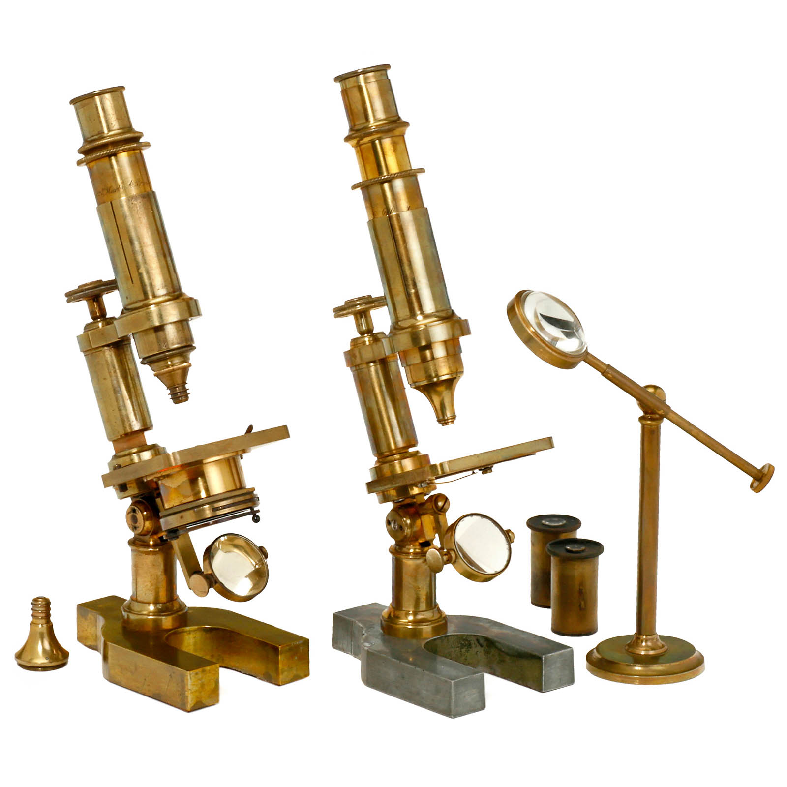 1) Signed: "E. Hartnack & Cie. Place Dauphine 21, Paris", no. 12910, with condenser. – And: 2) Signed: "Mon. E. Hartnack & A. Prazmowski sucr. Rue Bonaparte 1, Paris", no. 19447. – Each microscope 11 in. high, in fitted mahogany cases. – In addition: Separate bull's-eye magnifier on stand.