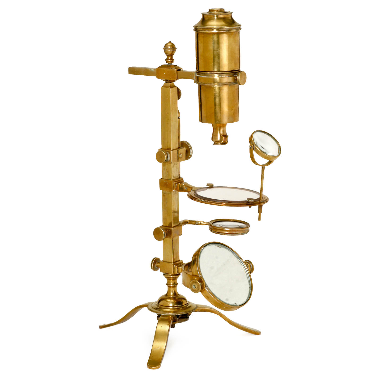 Made to the pattern of Louis Dellebarre, unmarked, probably by J. van Deijl of Amsterdam", whose paper label is found with the accessories. Polished brass, square pillar on fixed tripod base, single mirror (glass replaced), condensing lens and stage mounted on sliding sleeves, additional rack-and-pinion adjustment, 1 ocular, 4 objectives (numbered with dots), height 13 in., with accessories in metal case.