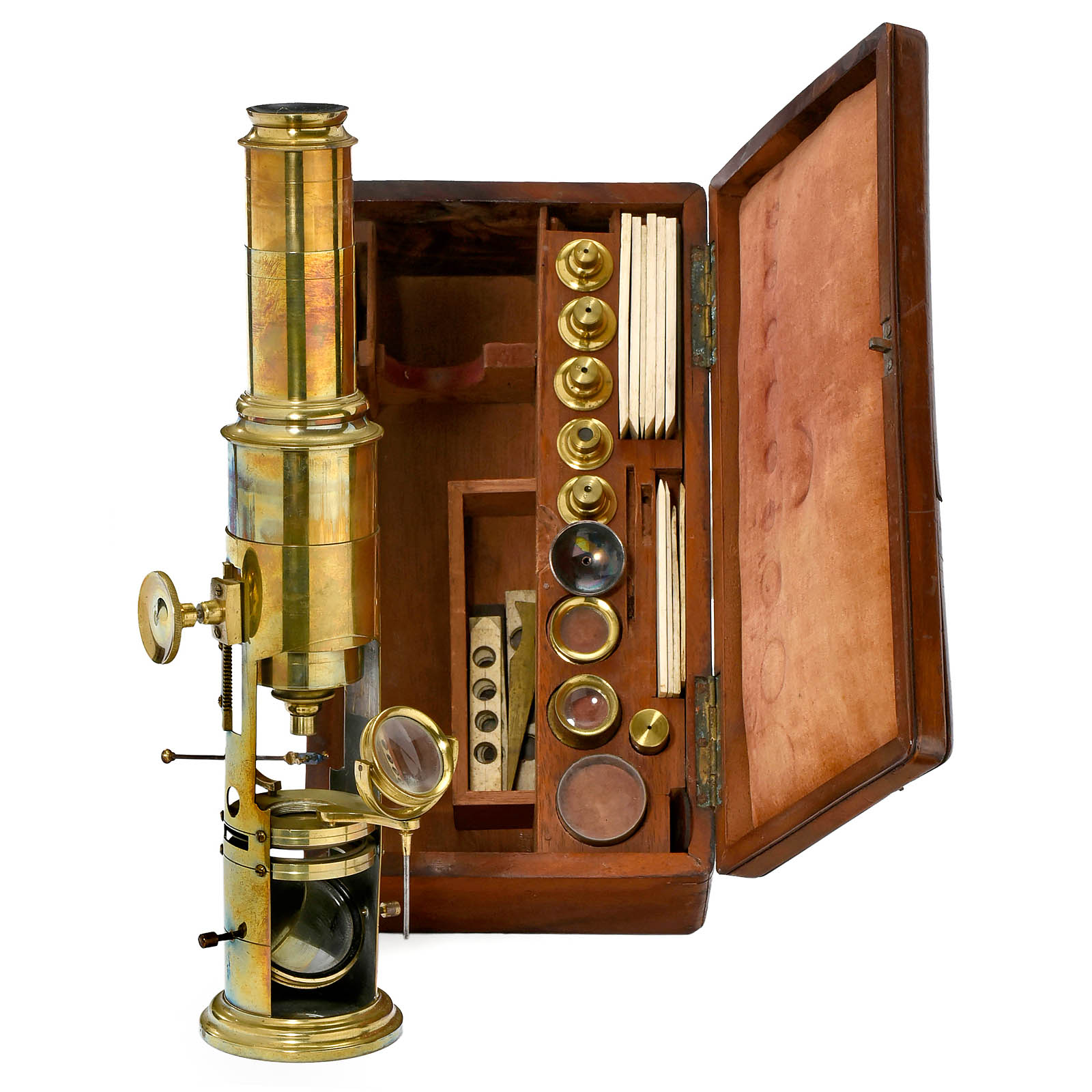 Unsigned, patinated brass, 27/8-inch Ø brass ring base, tubular stand with cutaway front and back, single mirror on pivot, fixed stage with spring plate beneath and openings for bull's-eye condenser and stage forceps (included), single draw tube, rack-and-pinion focusing, height 11 ½ in., 1 ocular, 6 objectives, 13 ivory and 3 ebony specimen slides, live-box, Lieberkühn and forceps, in fitted mahogany case.