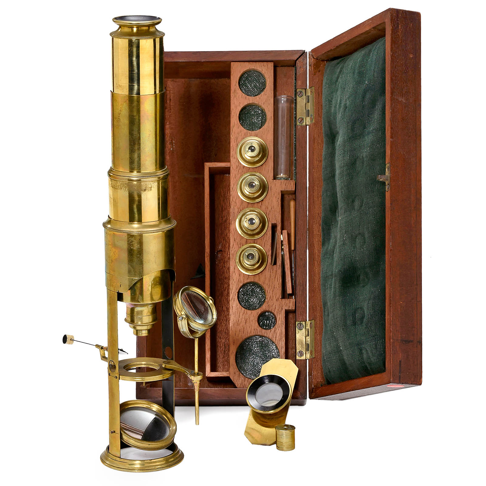 Unsigned, patinated brass, single concave mirror, circular stage with openings for forceps and condenser, double draw tube, fixed eyepiece, height 10 5/8 in., with 5 objectives, stage forceps, bull's eye, live-box and further accessories, in fitted mahogany case.