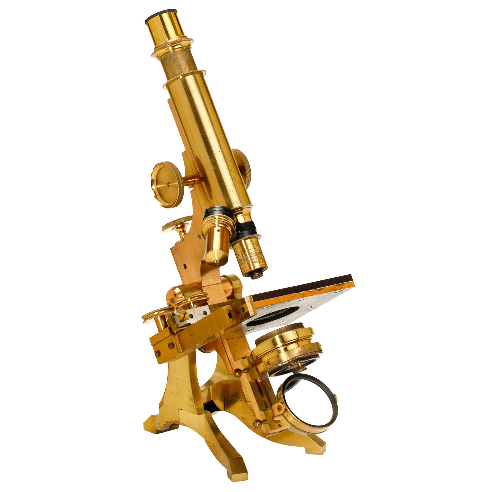 Engraved on base and stage "Ross, London", no. 5086, lacquered brass, double-turret, fine and coarse adjustment, mechanical stage, height-adjustable iris diaphragm and double-mirror, part-folding base, height 13 1/3 in., in fitted case.