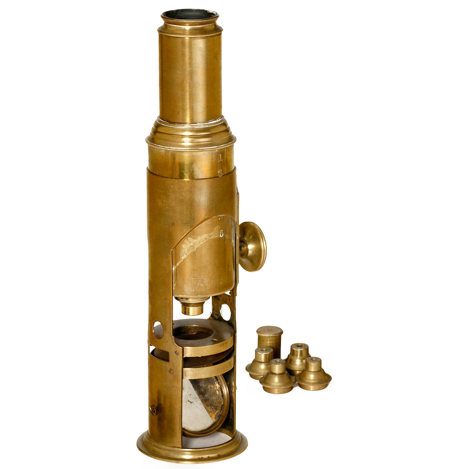 Signed on the tube: "J.P. Cutts Sons & Sutton, Opticians to Her Majesty, Sheffield", patinated brass, concave mirror, sprung circular stage, rack-and-pinion focusing, graduated drum, fixed ocular, 5 objectives (1–5), height 11 in., with 2 ivory slides, in fitted velvet-lines mahogany case.