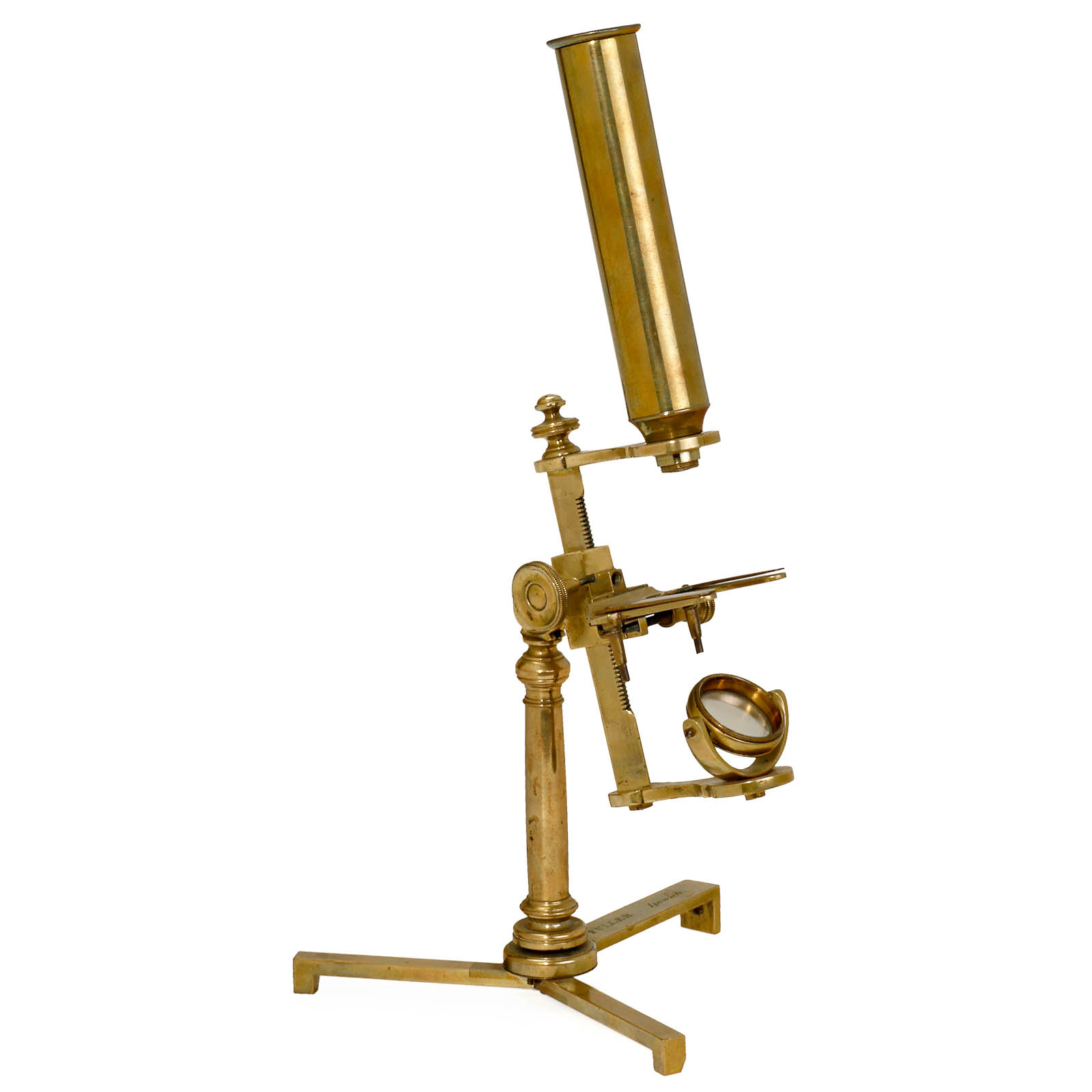 Jones-type, signed on the folding tripod base: "J. Fuller, Ipswich", polished brass, conical pillar capped by a compass joint, fixed spring stage, rack-and-pinion adjustment to the single mirror and the tube, 1 ocular, height 12 in.
