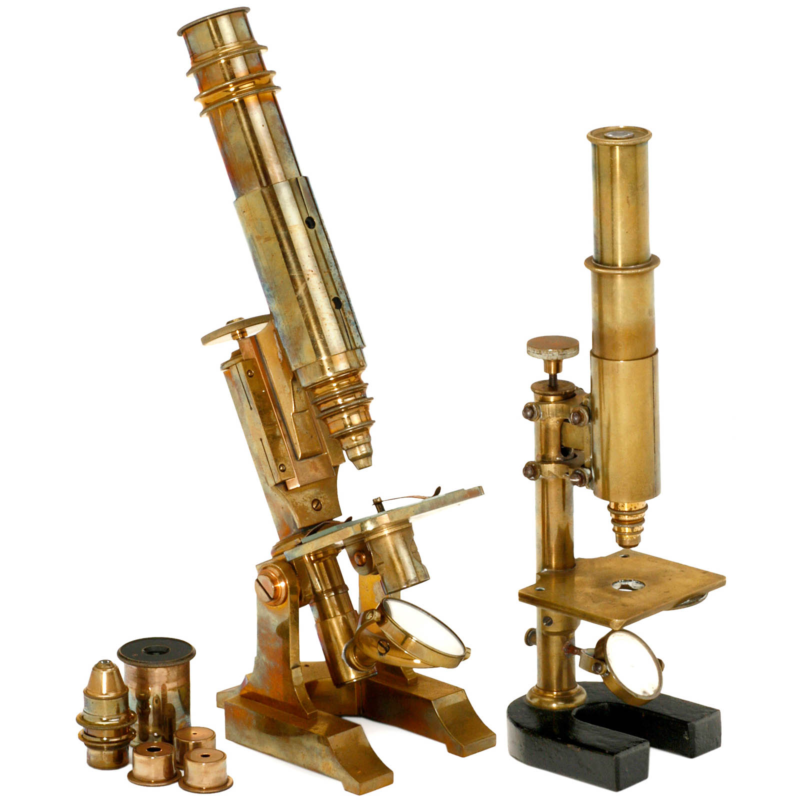 Unsigned, patinated brass. 1) Double-mirror, tilting stand, double draw tube, fine adjustment, 2 objectives, 2 oculars, height 12 ½ in., in fitted mahogany case. – And: 2) Black japanned iron horseshoe foot, single mirror, substage pinhole diaphragm, draw tube, fine adjustment, height 11 in.